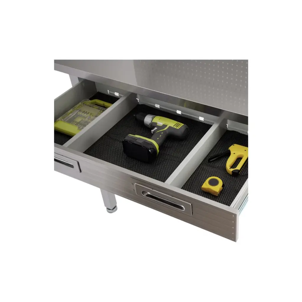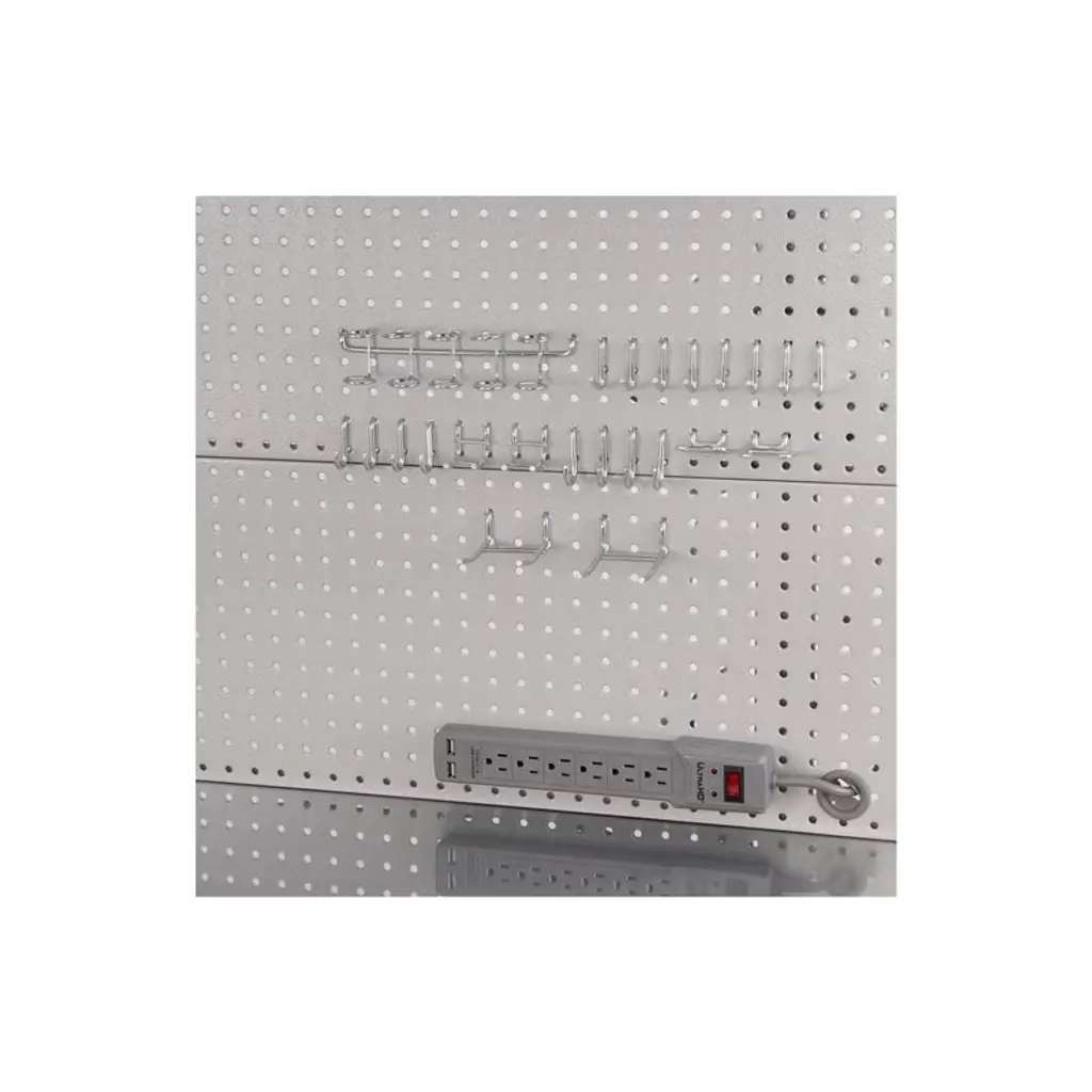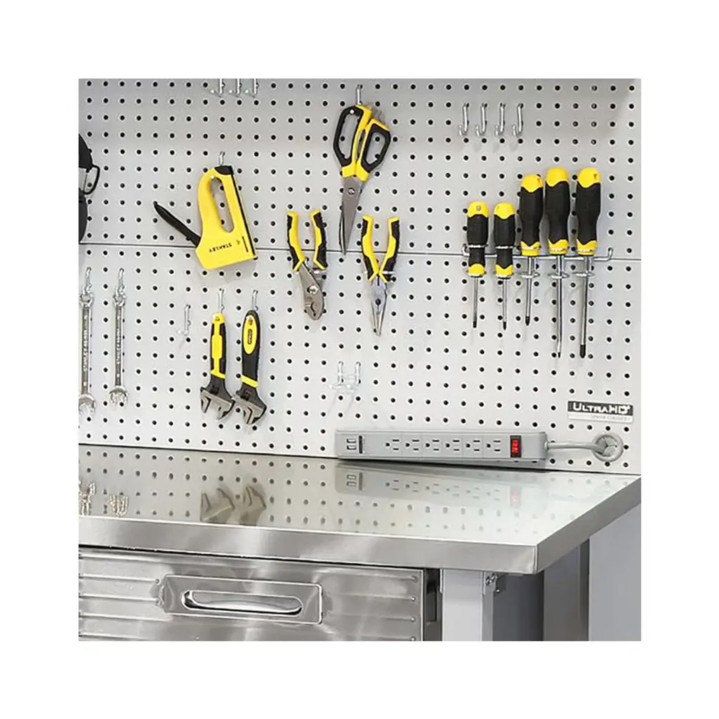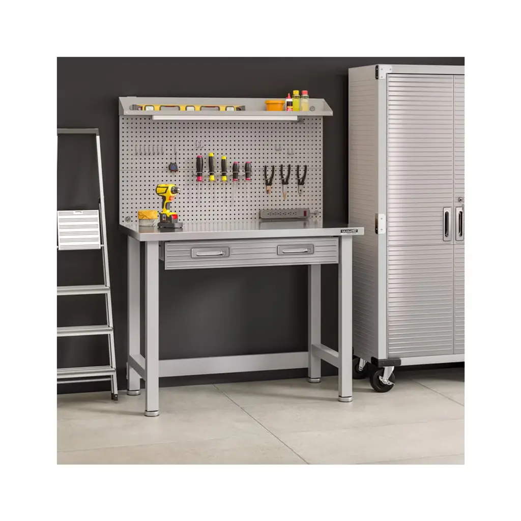 Upgrade your home or garage workshop with Seville Classics UltraHD lighted work center with steel pegboard. Enjoy a solid beech wood top (1.5" thick) mounted on a commercial-grade steel frame. Store tools and equipment on the large (24" x 48") steel pegboard which includes a 23-piece assortment of peg hooks, hangers, and holders. The table features a pull-out organizer drawer with adjustable dividers for sorting tools, gadgets, and supplies. Work into the night with a LED light beneath the cantilevered top shelf. The storage drawer features a stainless-steel front protected with UltraGuard fingerprint-resistant coating. All tools required for assembly are included for quick and easy setup. The assembled unit including the pegboard measures 48 inches wide by 24 inches deep and 65.5 inches high. The Table measures 48 inches wide by 24 inches deep and about 41.5 inches in height.