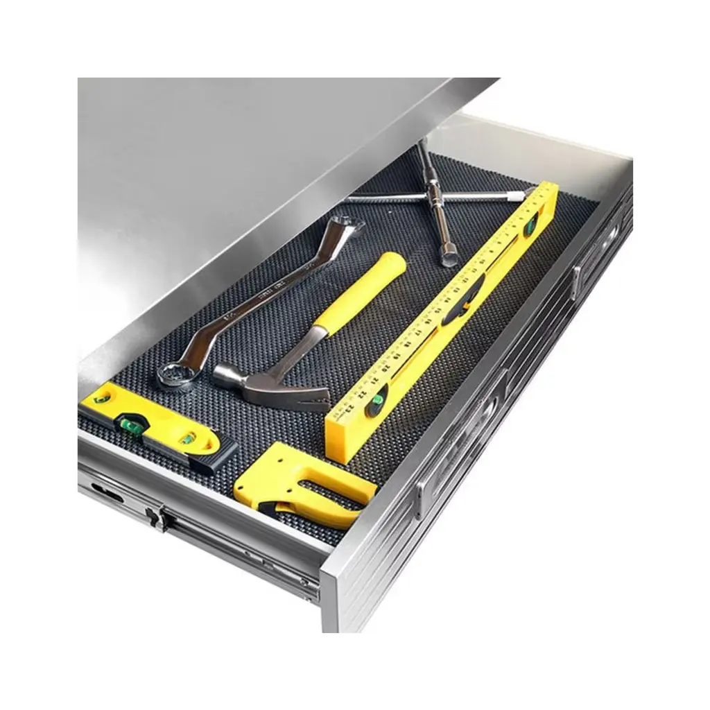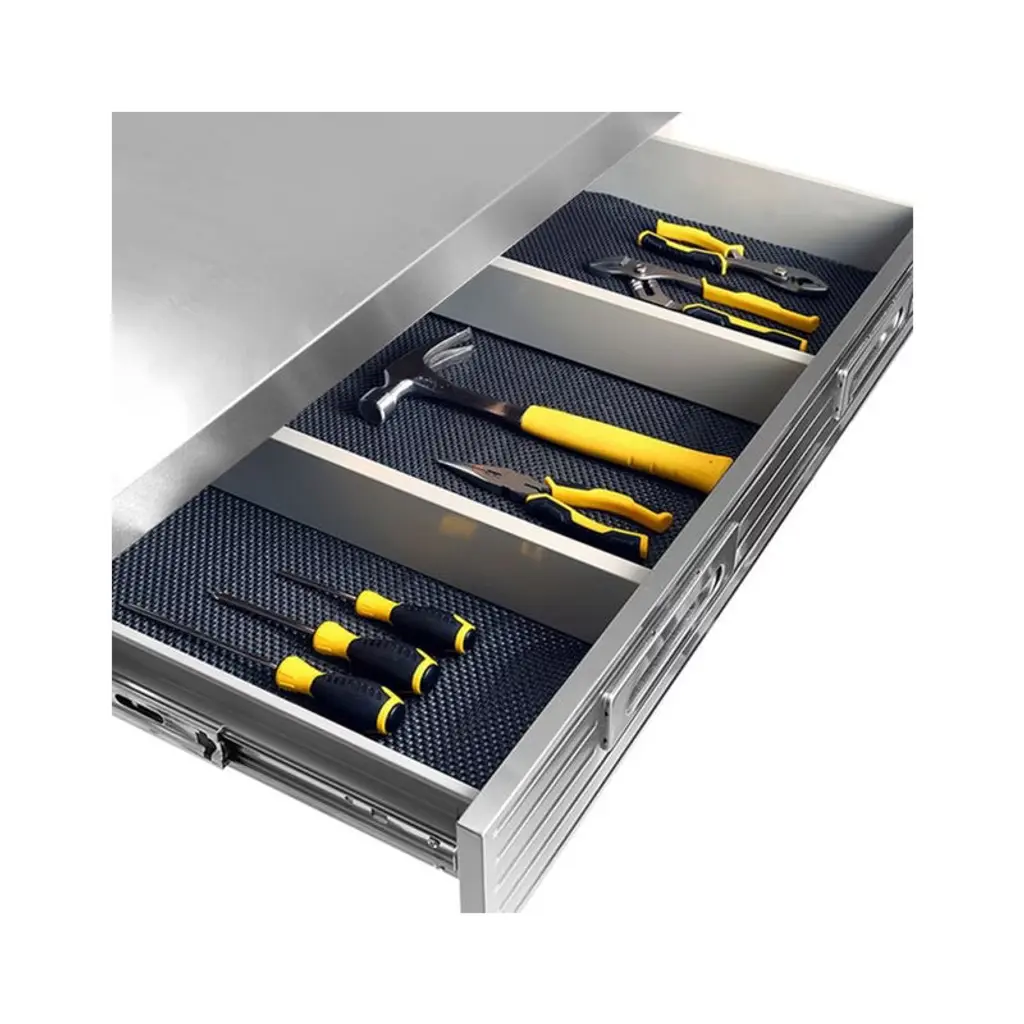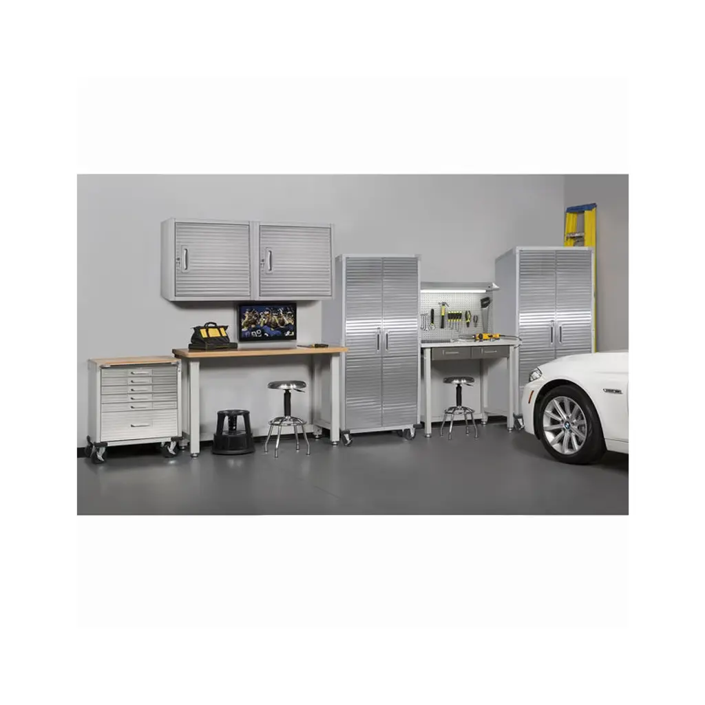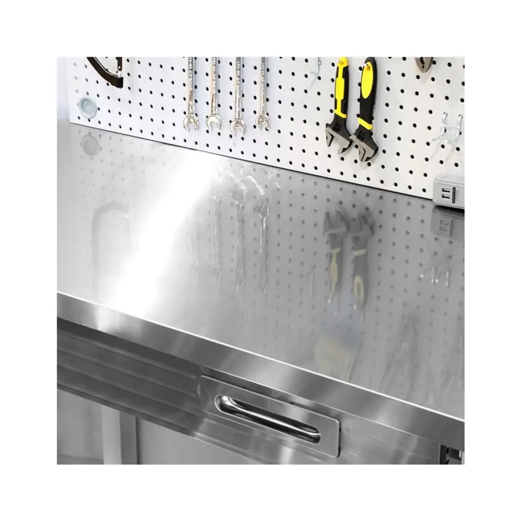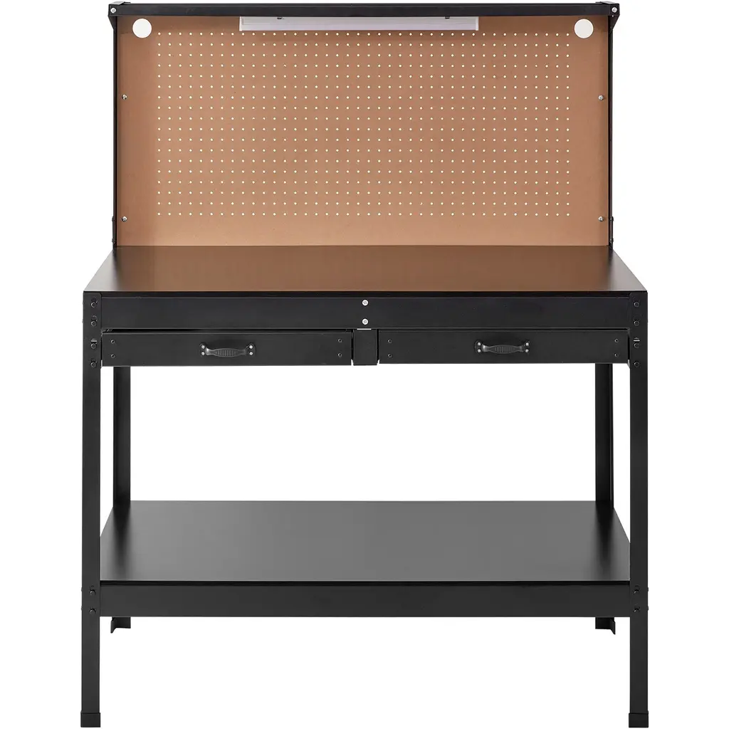 Upgrade your home or garage workshop with Seville Classics UltraHD lighted work center with steel pegboard. Enjoy a solid beech wood top (1.5" thick) mounted on a commercial-grade steel frame. Store tools and equipment on the large (24" x 48") steel pegboard which includes a 23-piece assortment of peg hooks, hangers, and holders. The table features a pull-out organizer drawer with adjustable dividers for sorting tools, gadgets, and supplies. Work into the night with a LED light beneath the cantilevered top shelf. The storage drawer features a stainless-steel front protected with UltraGuard fingerprint-resistant coating. All tools required for assembly are included for quick and easy setup. The assembled unit including the pegboard measures 48 inches wide by 24 inches deep and 65.5 inches high. The Table measures 48 inches wide by 24 inches deep and about 41.5 inches in height.
