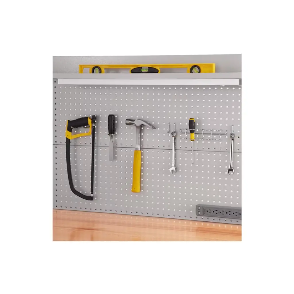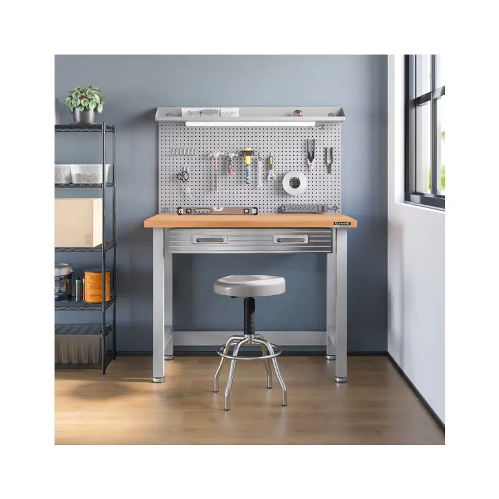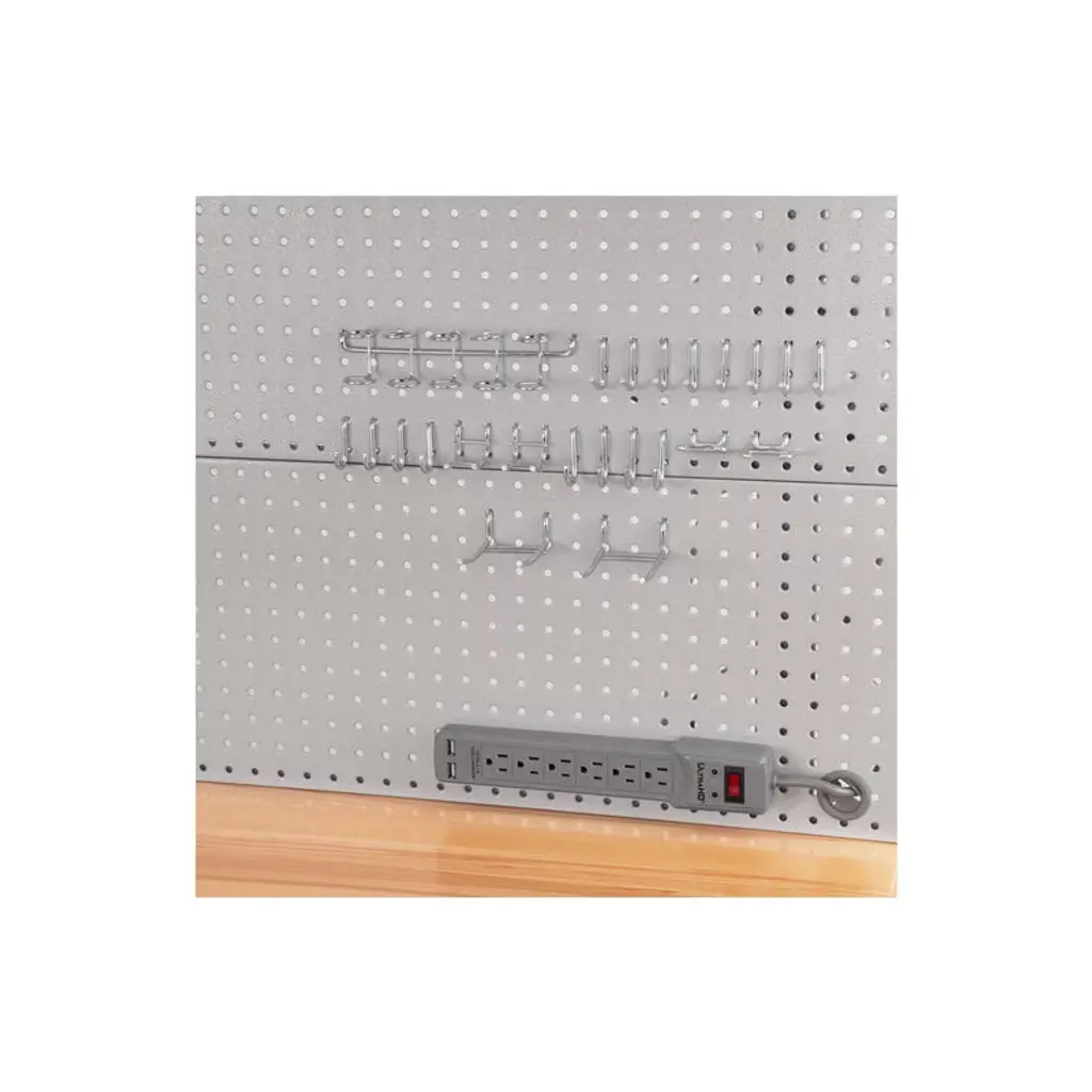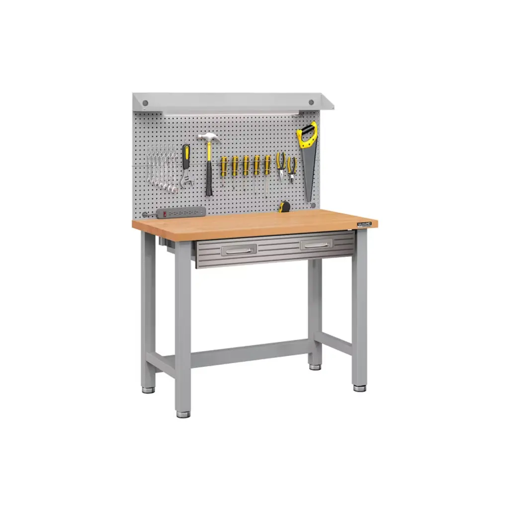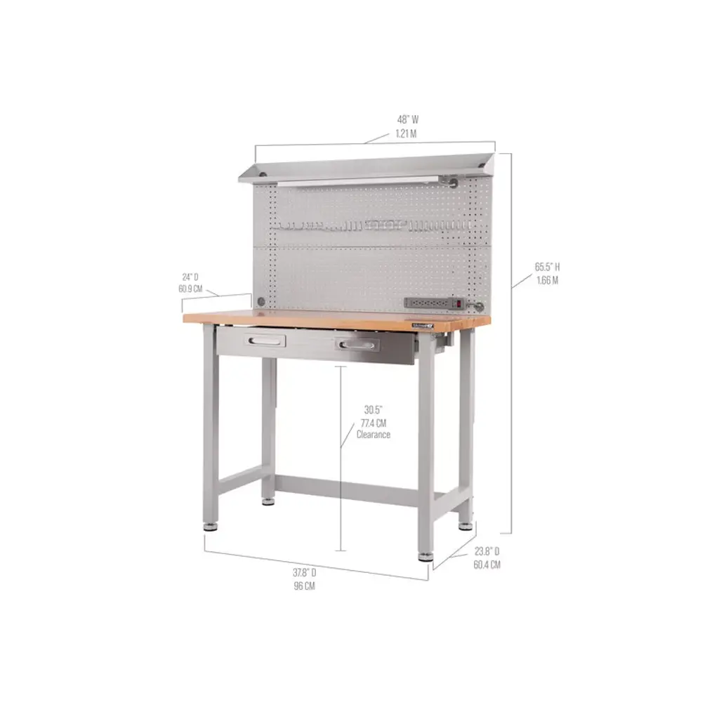 Build the perfect workshop with the Seville Classics UltraHD Lighted Pegboard Workcenter. This all-in-one set is designed to be the center of your workspace. The top of the workbench is made of thick (1. 5in.) solid hardwood measuring 4-feet wide and 2-feet deep. It's designed to work with most vices, clamps, table saws, and other workbench essentials. The bench supports up to 500 lbs. evenly distributed across the workbench top on a heavy-duty steel frame with padded leveling feet. Organize your workspace is easy with the full-size (48" W x 24" H) steel pegboard and peg hook set. Sort commonly used tools like screwdrivers and wrenches with an assortment of 23 hooks and hangers. An overhead cantilevered shelf (48in. W x 6in. D x 4in. H) provides more storage space for supplies while you work. Stay productive into the night on color-sensitive projects with the LED overhead light. The included 6-outlet power strip with dual USB charging ports lets you charge your smart devices while you work. Keep your tools and hardware easily accessible in the pull-out organizer storage drawer. Two drop-in dividers and seven mounting positions let you organize the space as you like. A non-slip mat prevents your gear from moving around when the drawer opens and closes. Drawer can hold up to 60 lbs evenly distributed. The drawer front is made of stainless steel and finished with our UltraGuard fingerprint-resistant coating for protection against smudges. Combine with other UltraHD storage cabinets and workbenches to create the ultimate workshop.