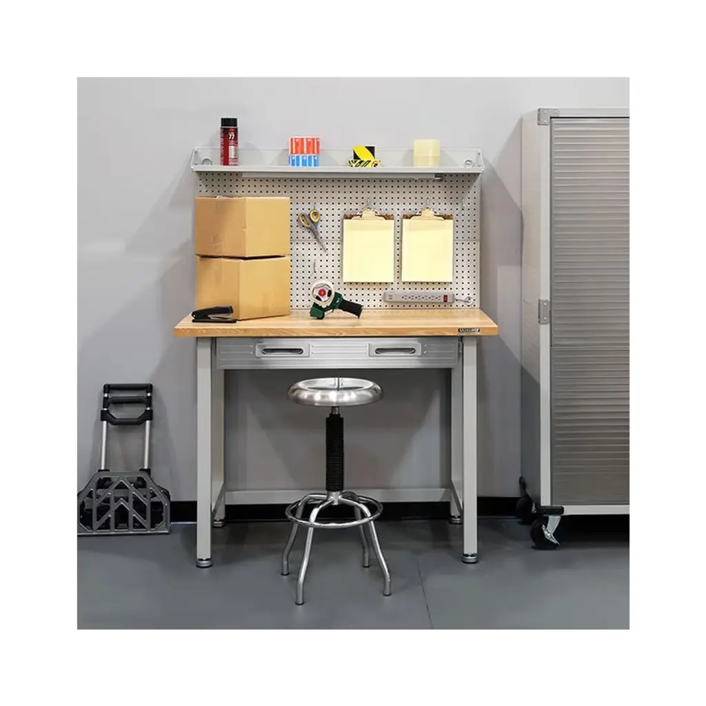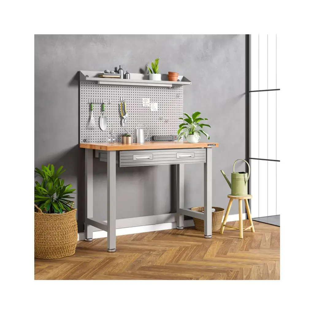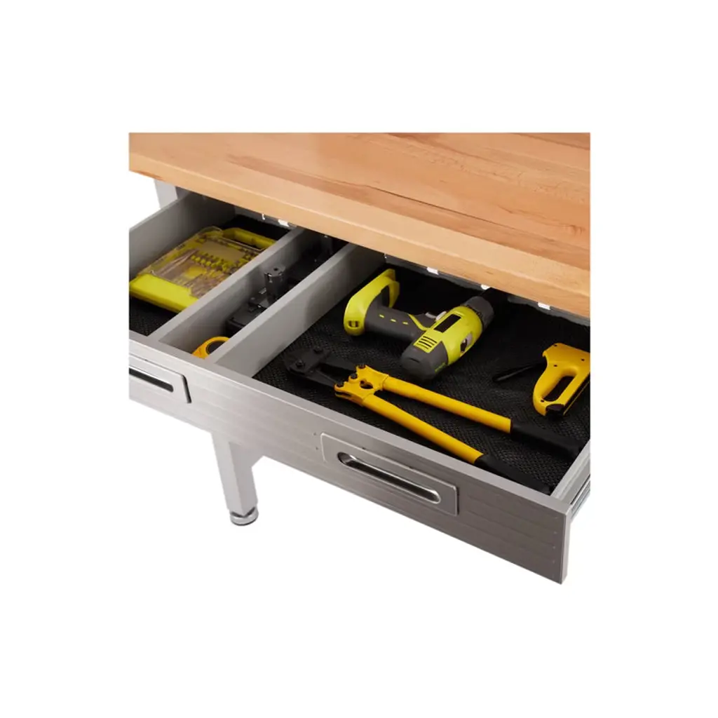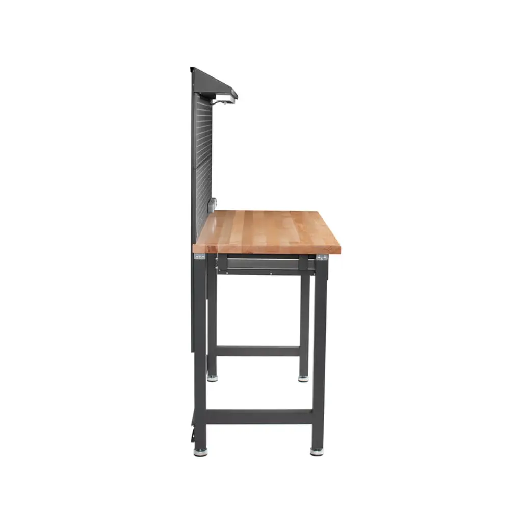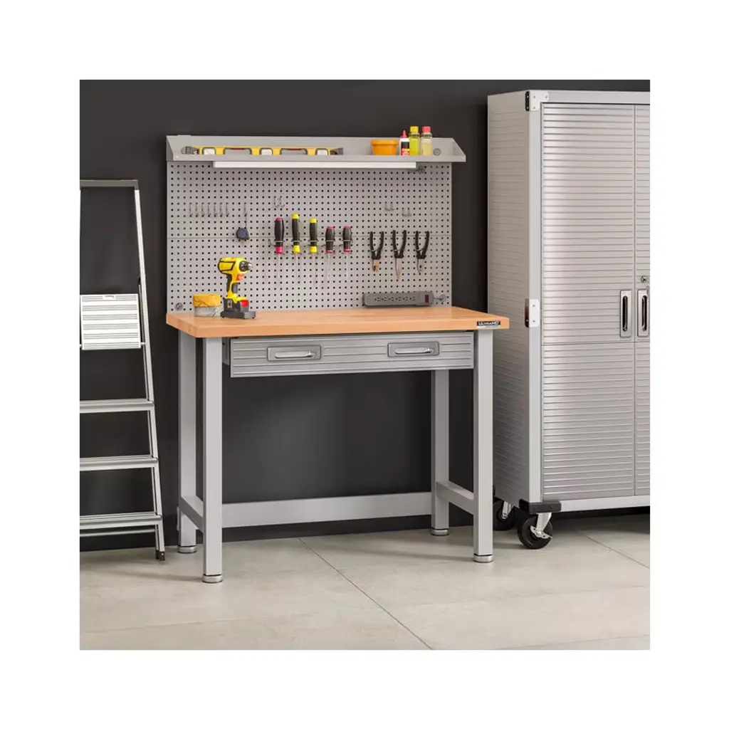 Build the perfect workshop with the Seville Classics UltraHD Lighted Pegboard Workcenter. This all-in-one set is designed to be the center of your workspace. The top of the workbench is made of thick (1. 5in.) solid hardwood measuring 4-feet wide and 2-feet deep. It's designed to work with most vices, clamps, table saws, and other workbench essentials. The bench supports up to 500 lbs. evenly distributed across the workbench top on a heavy-duty steel frame with padded leveling feet. Organize your workspace is easy with the full-size (48" W x 24" H) steel pegboard and peg hook set. Sort commonly used tools like screwdrivers and wrenches with an assortment of 23 hooks and hangers. An overhead cantilevered shelf (48in. W x 6in. D x 4in. H) provides more storage space for supplies while you work. Stay productive into the night on color-sensitive projects with the LED overhead light. The included 6-outlet power strip with dual USB charging ports lets you charge your smart devices while you work. Keep your tools and hardware easily accessible in the pull-out organizer storage drawer. Two drop-in dividers and seven mounting positions let you organize the space as you like. A non-slip mat prevents your gear from moving around when the drawer opens and closes. Drawer can hold up to 60 lbs evenly distributed. The drawer front is made of stainless steel and finished with our UltraGuard fingerprint-resistant coating for protection against smudges. Combine with other UltraHD storage cabinets and workbenches to create the ultimate workshop.