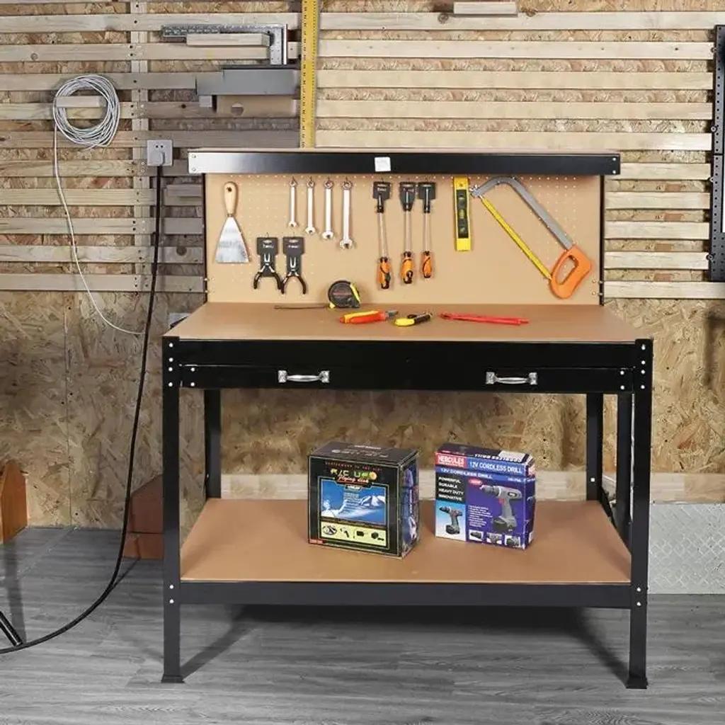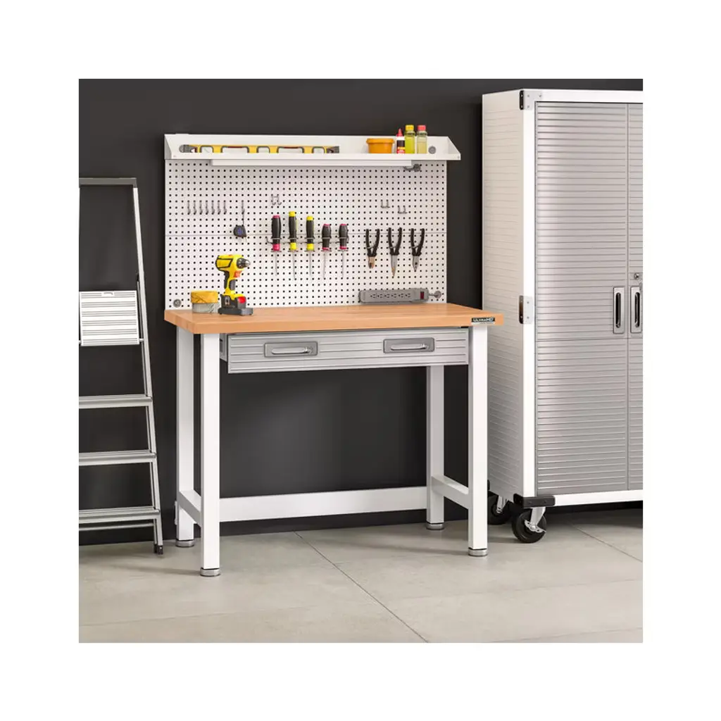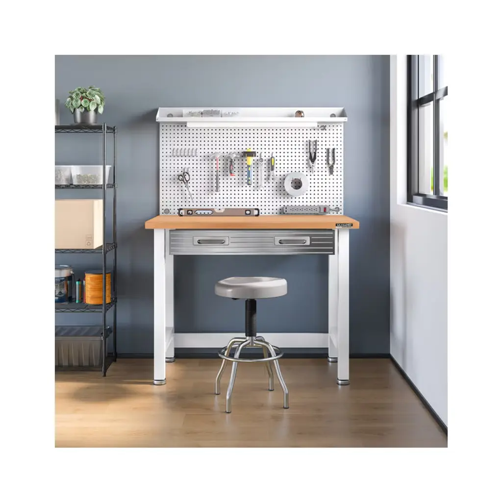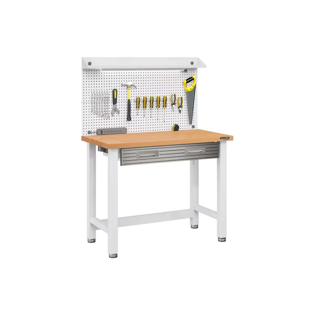 Build the perfect workshop with the Seville Classics UltraHD Lighted Pegboard Workcenter. This all-in-one set is designed to be the center of your workspace. The top of the workbench is made of thick (1. 5in.) solid hardwood measuring 4-feet wide and 2-feet deep. It's designed to work with most vices, clamps, table saws, and other workbench essentials. The bench supports up to 500 lbs. evenly distributed across the workbench top on a heavy-duty steel frame with padded leveling feet. Organize your workspace is easy with the full-size (48" W x 24" H) steel pegboard and peg hook set. Sort commonly used tools like screwdrivers and wrenches with an assortment of 23 hooks and hangers. An overhead cantilevered shelf (48in. W x 6in. D x 4in. H) provides more storage space for supplies while you work. Stay productive into the night on color-sensitive projects with the LED overhead light. The included 6-outlet power strip with dual USB charging ports lets you charge your smart devices while you work. Keep your tools and hardware easily accessible in the pull-out organizer storage drawer. Two drop-in dividers and seven mounting positions let you organize the space as you like. A non-slip mat prevents your gear from moving around when the drawer opens and closes. Drawer can hold up to 60 lbs evenly distributed. The drawer front is made of stainless steel and finished with our UltraGuard fingerprint-resistant coating for protection against smudges. Combine with other UltraHD storage cabinets and workbenches to create the ultimate workshop.