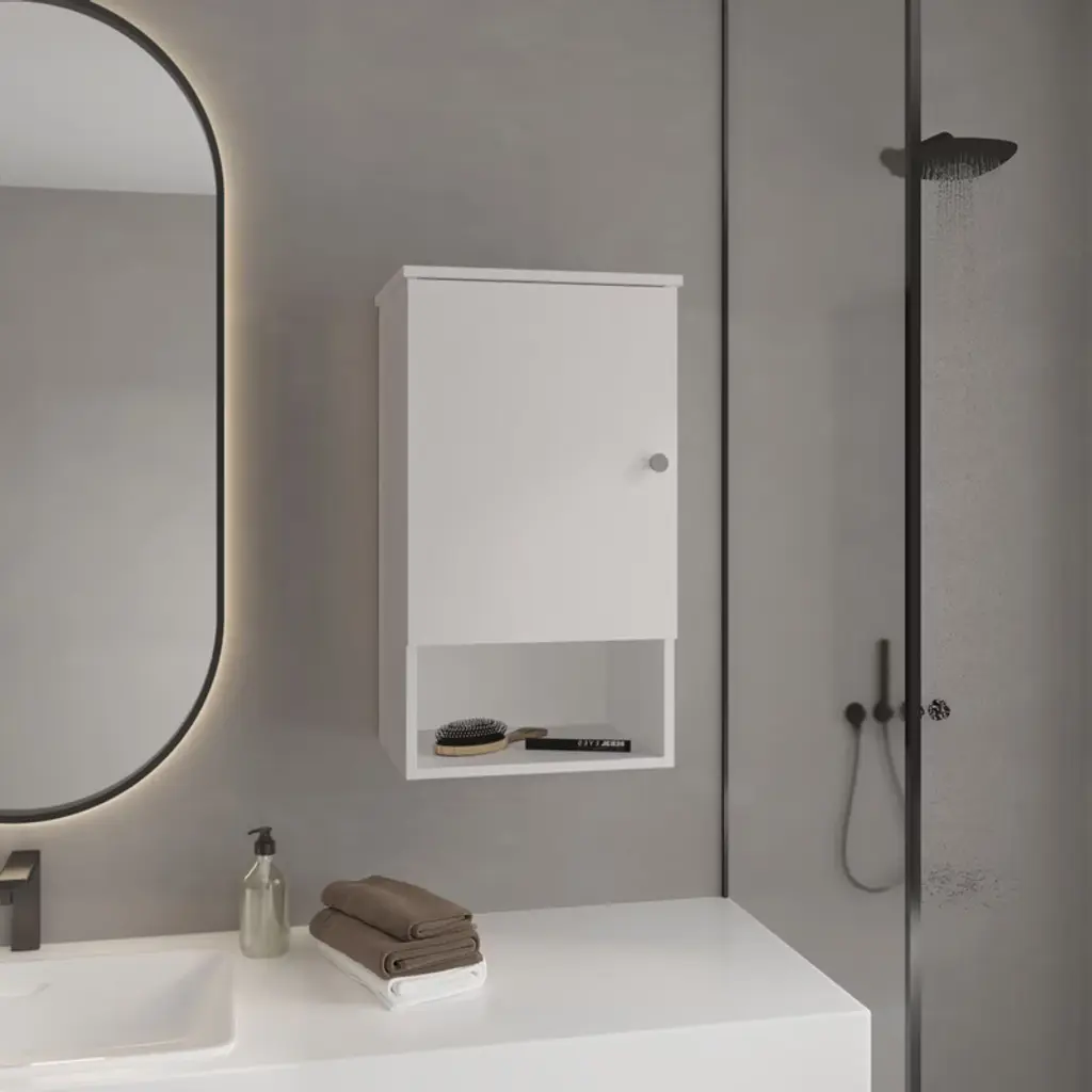 SEVOBAL Bathroom Storage Cabinets offers a wall mounted single door cabinet with multiple shelves for practical and organized storage. The modern design adds a clean touch while holding toiletries and personal items. Crafted from high quality manufactured wood the cabinet ensures durable use. Its compact wall mounted design saves floor and counter space while keeping essentials neatly arranged and enhancing bathroom decor.