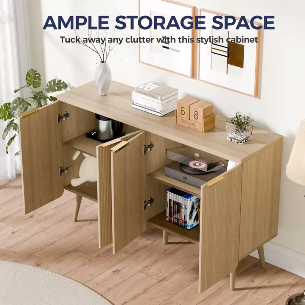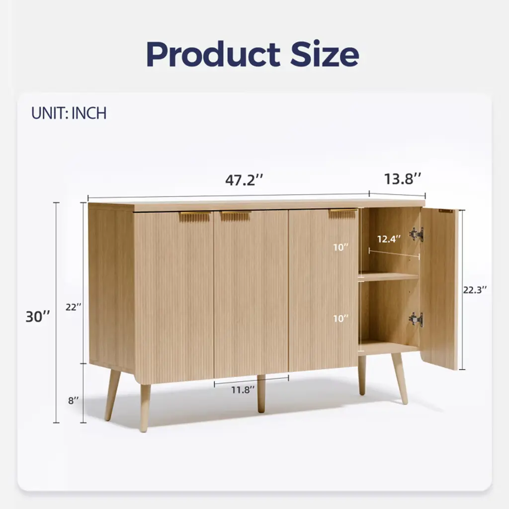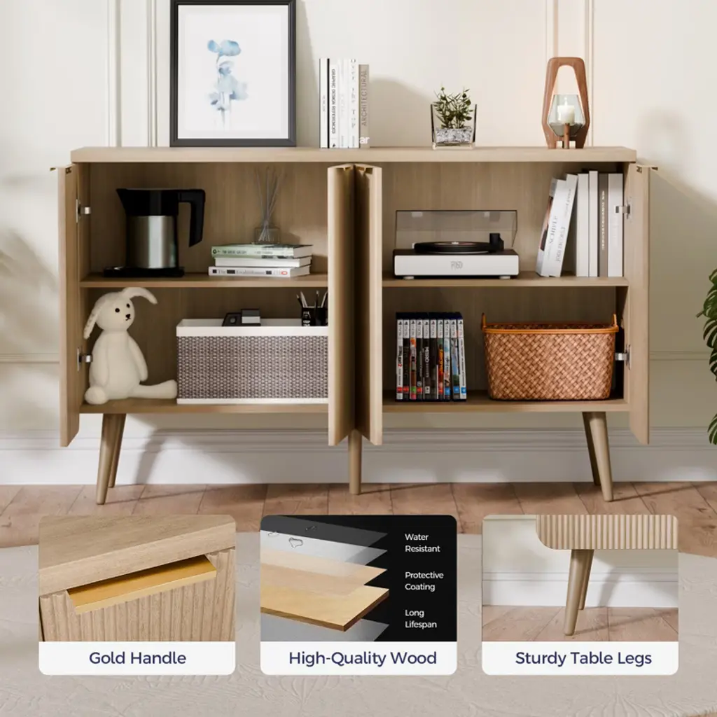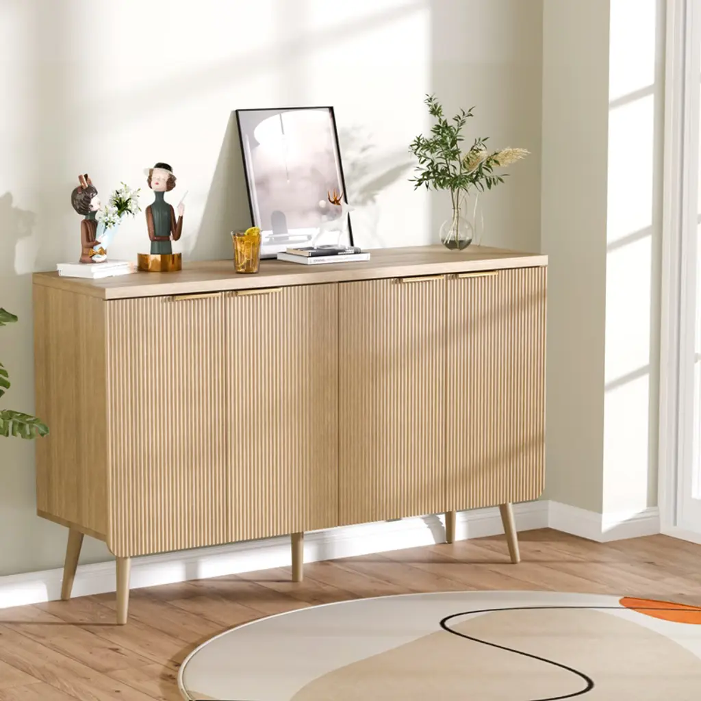 Sevobal Decorative Storage Cabinets, Rounded Corner Striped Four Door Cabinet, Modern Cabinet For Kitchen Living Room, Light Brown 47.2*13.8*30