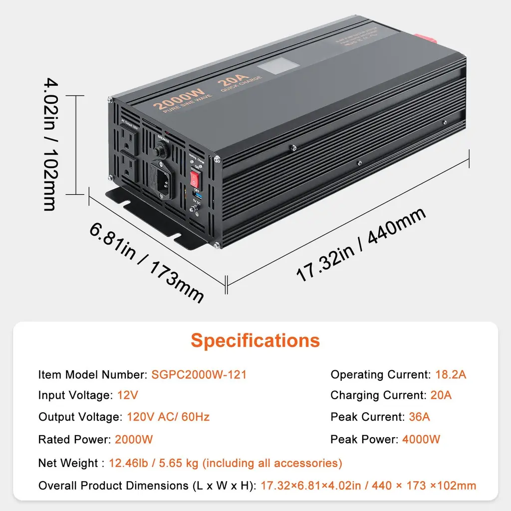 Unmatched Power: The VEVOR sump pump battery backup inverter features a robust 2000W/2500W output, 18.2A( for 2000W option)/22.7A ( for 2500W option )operating current, and dual outlets, ready to support two sump pumps at once. Even if the power goes out on a rainy day, it automatically switches to battery power to keep your sump pump working. Trust VEVOR to keep your basement secure and dry around the clock! Real-Time Display: Stay informed and in control with the VEVOR sump pump battery backup system's real-time display feature! With a cutting-edge high-definition LCD screen and LED indicator lights, you can instantly monitor vital information such as voltage, power, battery level, and more. Enjoy confident and informed decision-making every step of the way! Quick Plug Feature: Say goodbye to cumbersome and unsafe wiring connections! Our inverter for sump pump features a convenient 3-Pin plug design, ensuring a quick and secure installation. Not only does this avoid incorrect wiring that could damage your equipment, but it also reduces security risks, providing you with peace of mind and hassle-free operation. Security Comes First: Experience peace of mind with sump pump backup battery's multi-layered security protection. From start to finish, we've got you covered, blocking potential hazards and providing reliable protection against any unforeseen risks, such as overload protection, short circuit protection, overcharge protection, overvoltage protection, overheat protection, and circuit breaker. Lightning Fast Charging: With a 20A charging current, you won't be stuck waiting around. Our VEVOR sump pump battery backup power supply charges your 100AH battery in just about 5 hours - that's four times faster than a 5A charger. Get back up and running in no time with our lightning-fast charging technology. Package Content 2 x Battery Connecting Cables 6 x 40A Fuses 1 x Power Cord