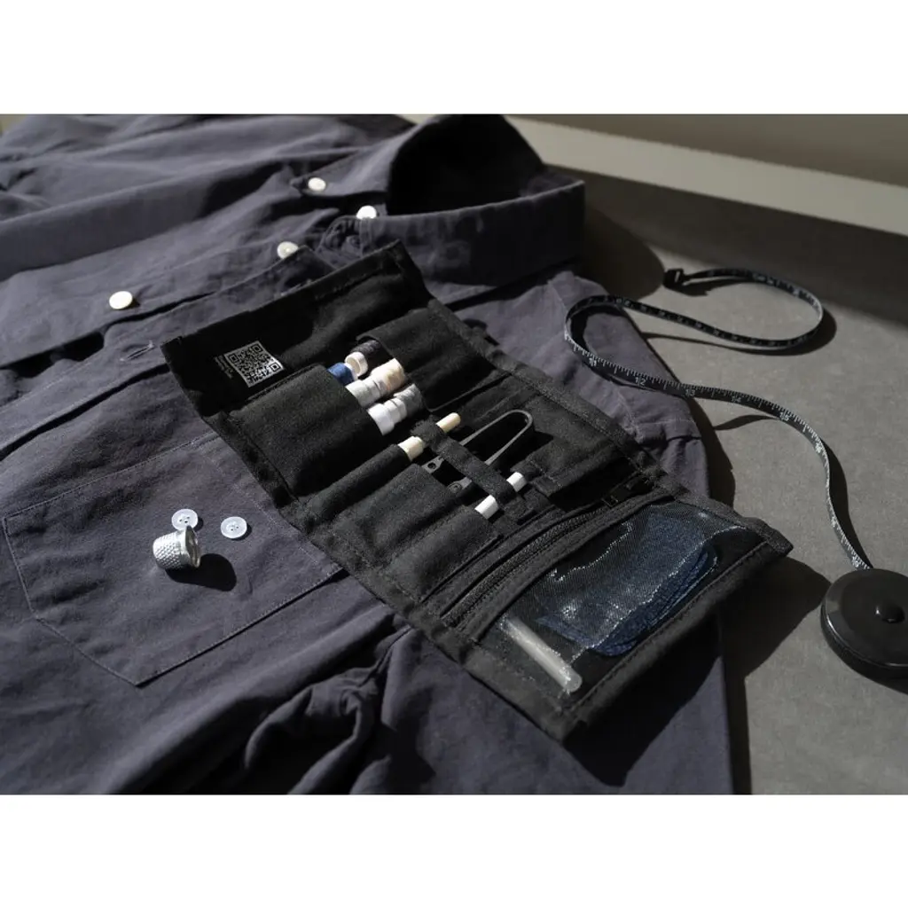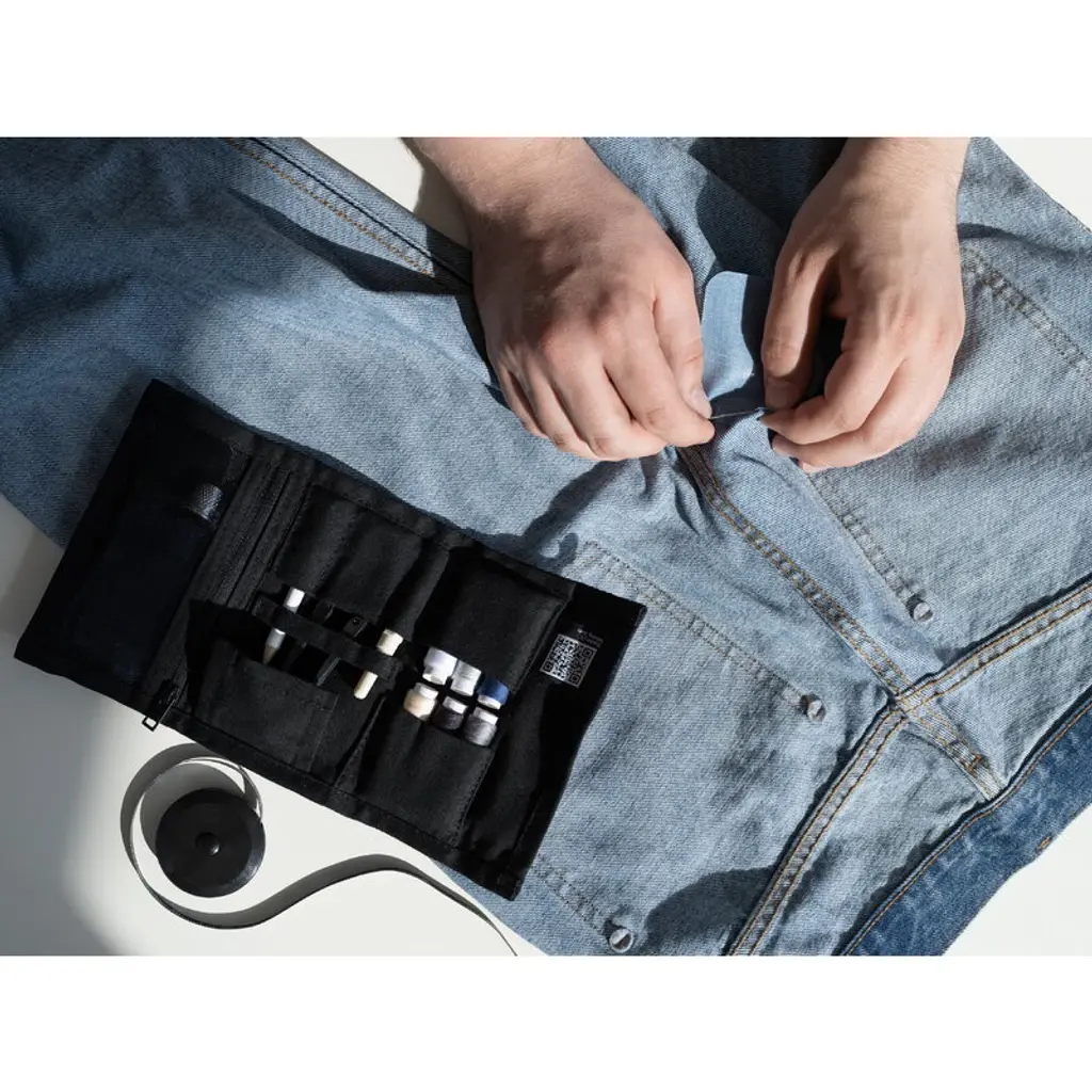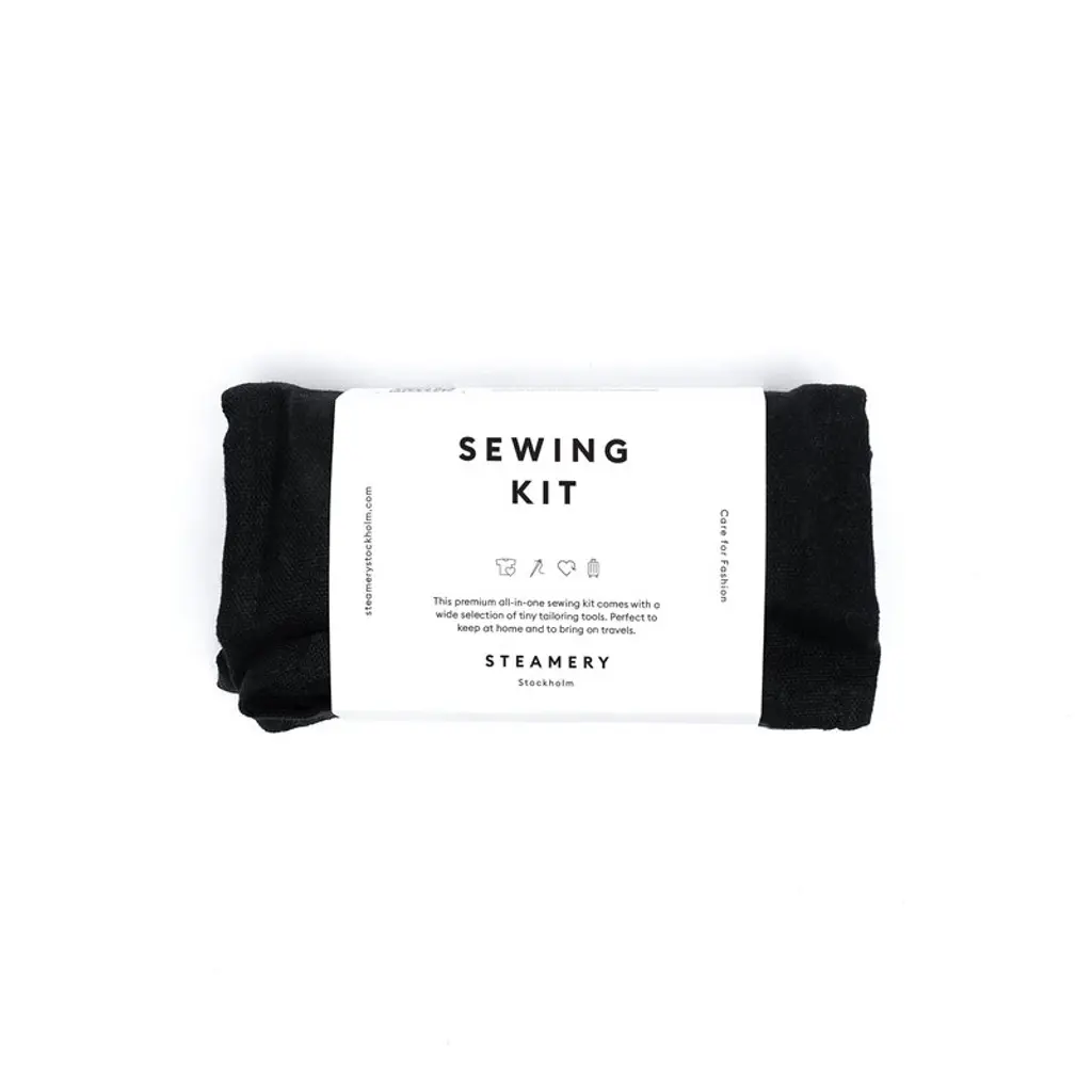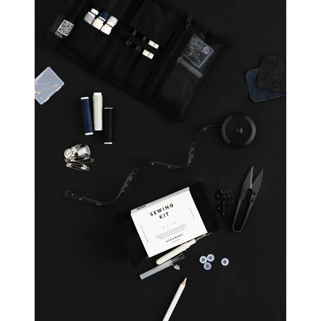 Steamery's sewing kit is designed to help you take care of your garments yourself. Created in collaboration with professional tailors, the kit includes all the essential tools and supplies for repairing clothes, packed up in a neat roll-up case that you can easily pack in a suitcase when traveling, for example. The set includes: 6 threads (black, blue, dark gray, light gray, white and light beige) Scissors Seam ripper Fabric pen 7 needles 10 sewing pins 4 safety pins Metal thimble Measuring tape (length: 150 cm) 5 quick patches 12 buttons (black and white) Needle threader