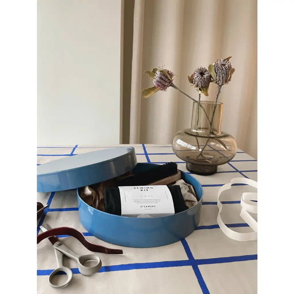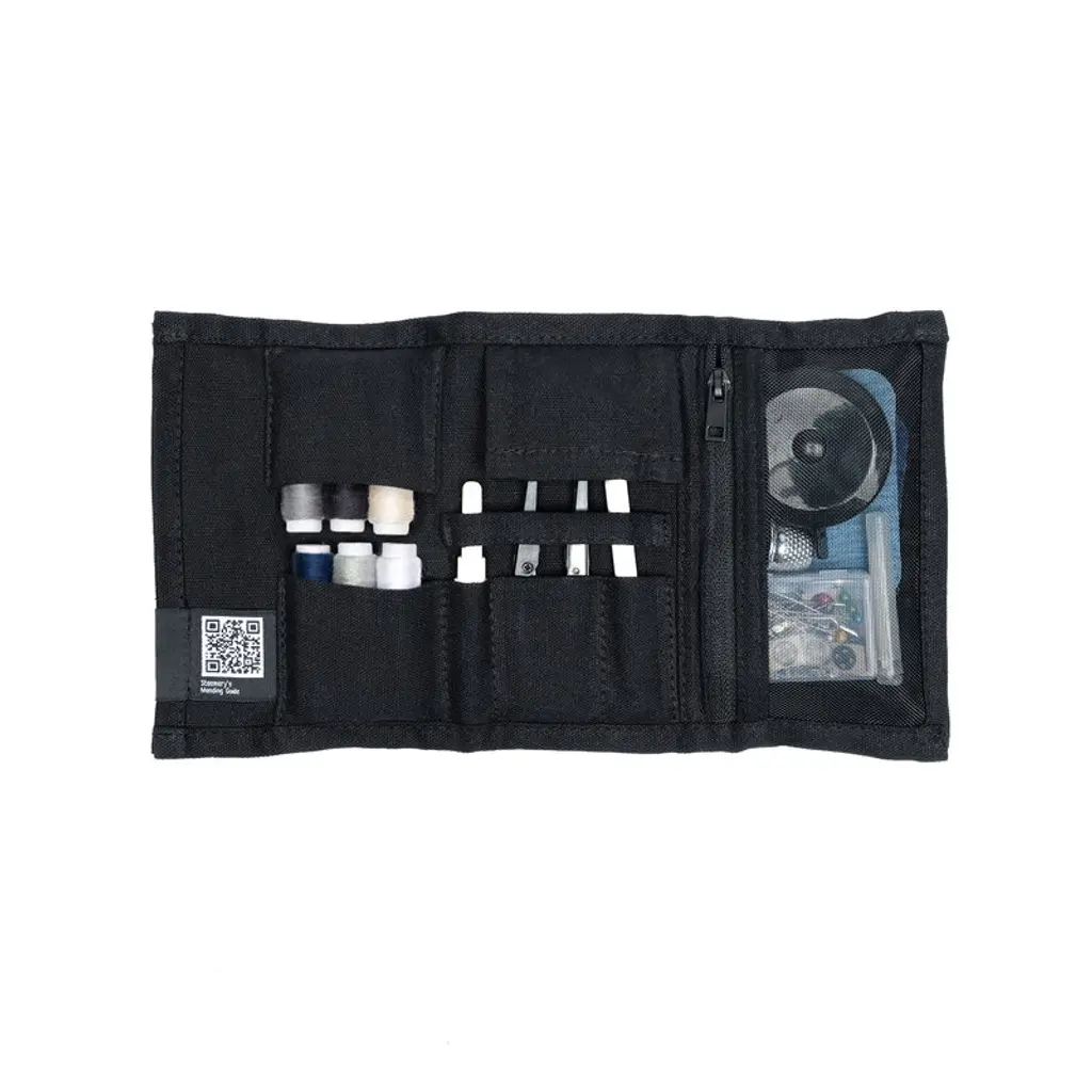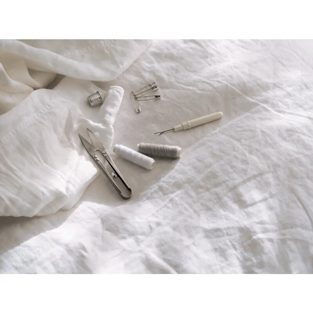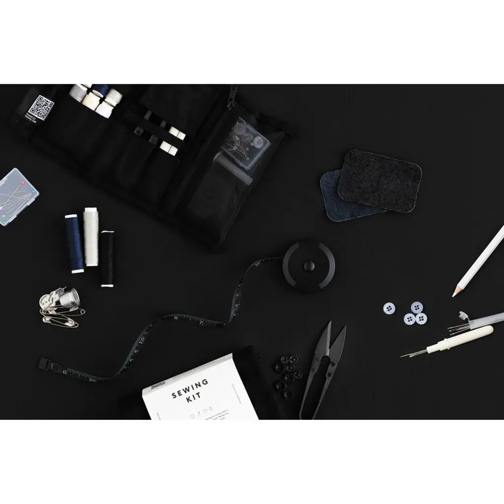 Steamery's sewing kit is designed to help you take care of your garments yourself. Created in collaboration with professional tailors, the kit includes all the essential tools and supplies for repairing clothes, packed up in a neat roll-up case that you can easily pack in a suitcase when traveling, for example. The set includes: 6 threads (black, blue, dark gray, light gray, white and light beige) Scissors Seam ripper Fabric pen 7 needles 10 sewing pins 4 safety pins Metal thimble Measuring tape (length: 150 cm) 5 quick patches 12 buttons (black and white) Needle threader