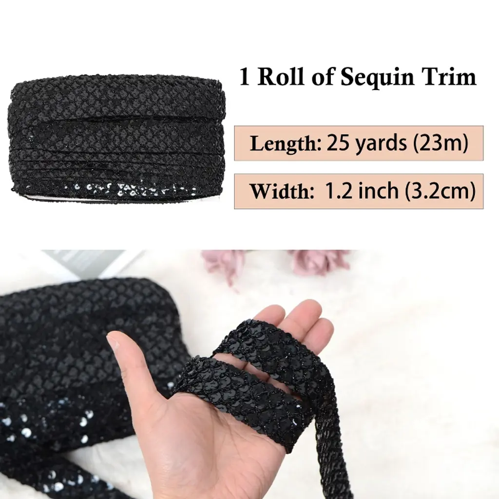 Sewing Sequin Trim 1.2 Inch 6 Row, 25 Yards Glitter Sequin Strip Ribbon Metallic Stretch Bling Fabric Diy Craft Decoration, Black