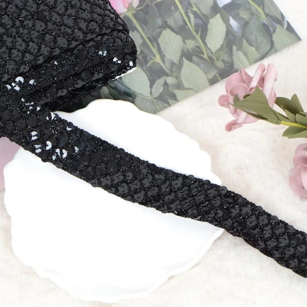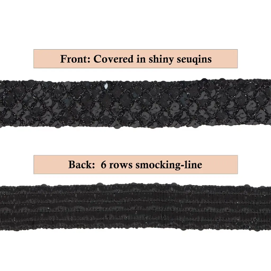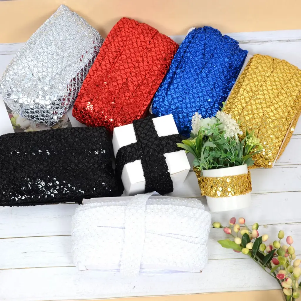 This wide glitter sequin ribbon strip is designed to add a dazzling touch of elegance. Great for embellishing wedding dresses, creating stunning headbands, and decorating costumes for special occasions like Christmas, Halloween, and New Year’s parties.The metallic stretch sequin strip features a flat paillette design that ensures easy application, whether you're sewing it onto fabric or using it for gift packaging. Its wide, glittery surface provides extensive coverage and a luxurious look, while its stretchy nature makes it versatile for various DIY craft decorations.