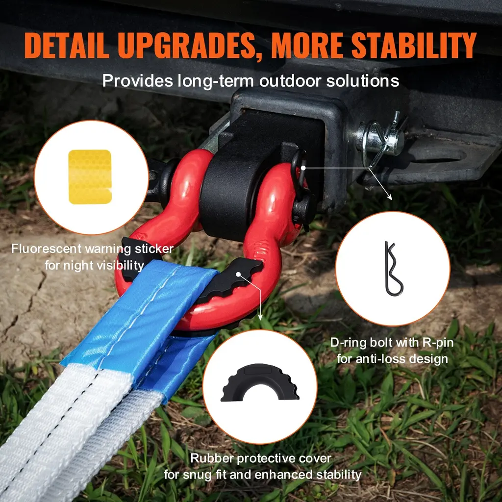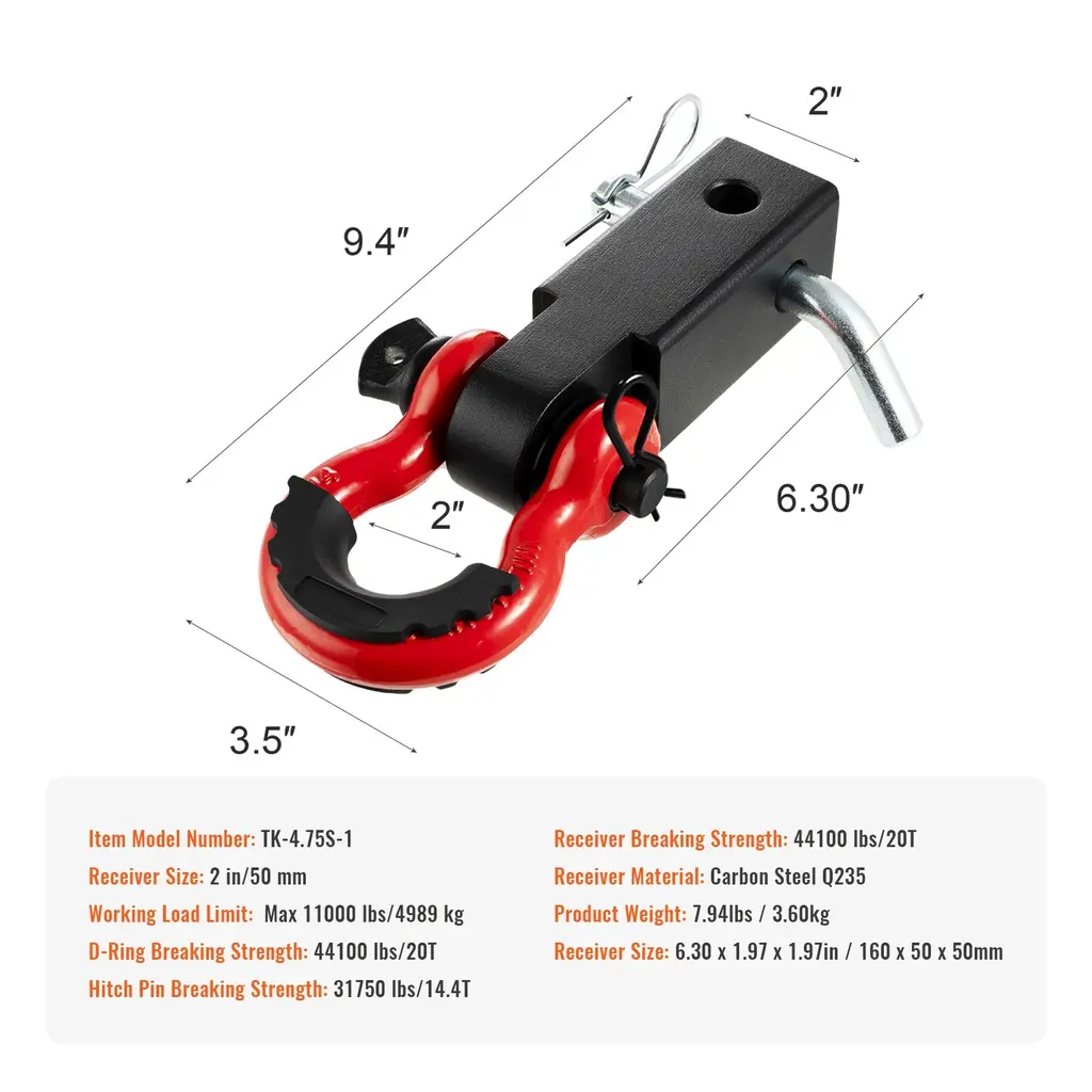High Load Capacity: Capable of towing up to 11,000 lbs, our shackle hitch receiver tackles big jobs with ease. Perfect for RVs, SUVs, and vans, it provides the stability and strength you need for demanding tasks without compromising on security. Industrial-Grade Carbon Steel: Constructed from industrial-grade material, this lightweight yet durable tow hitch receiver stands up to wear and tear. Its superior corrosion resistance ensures it can handle any environment, extending its life and your adventures. Protective Coating: With special baked-on paint, our shackle mount trailer hitch boasts excellent protection against rust, splashes, and scratches. This durable layer keeps your setup looking new and dependable, even in tough weather. Enhanced Details: Get your shackle trailer hitch up and running in no time—no welding or complex tools needed! Just connect the shackle, and you're set. Enhanced security features like a D-ring bolt with an R-pin and a bright reflective sticker improve visibility and security at night. Versatile and Essential: Ideal for more than just towing, this recovery hitch receiver is your go-to for rescues, camping, and barbecues. Its multifunctional design ensures it's an essential part of your kit, ready to support your outdoor adventures whenever, wherever. Package Content 1 x Shackle Hitch Receiver