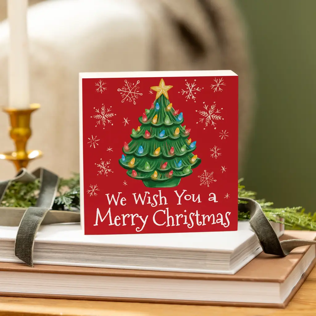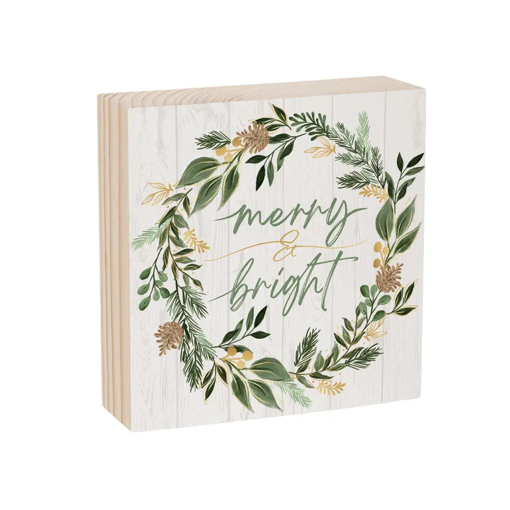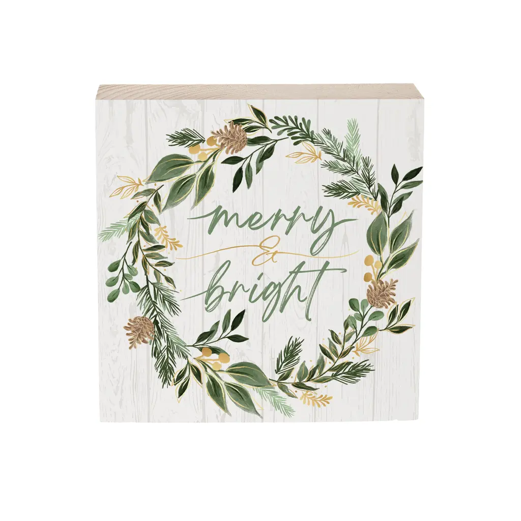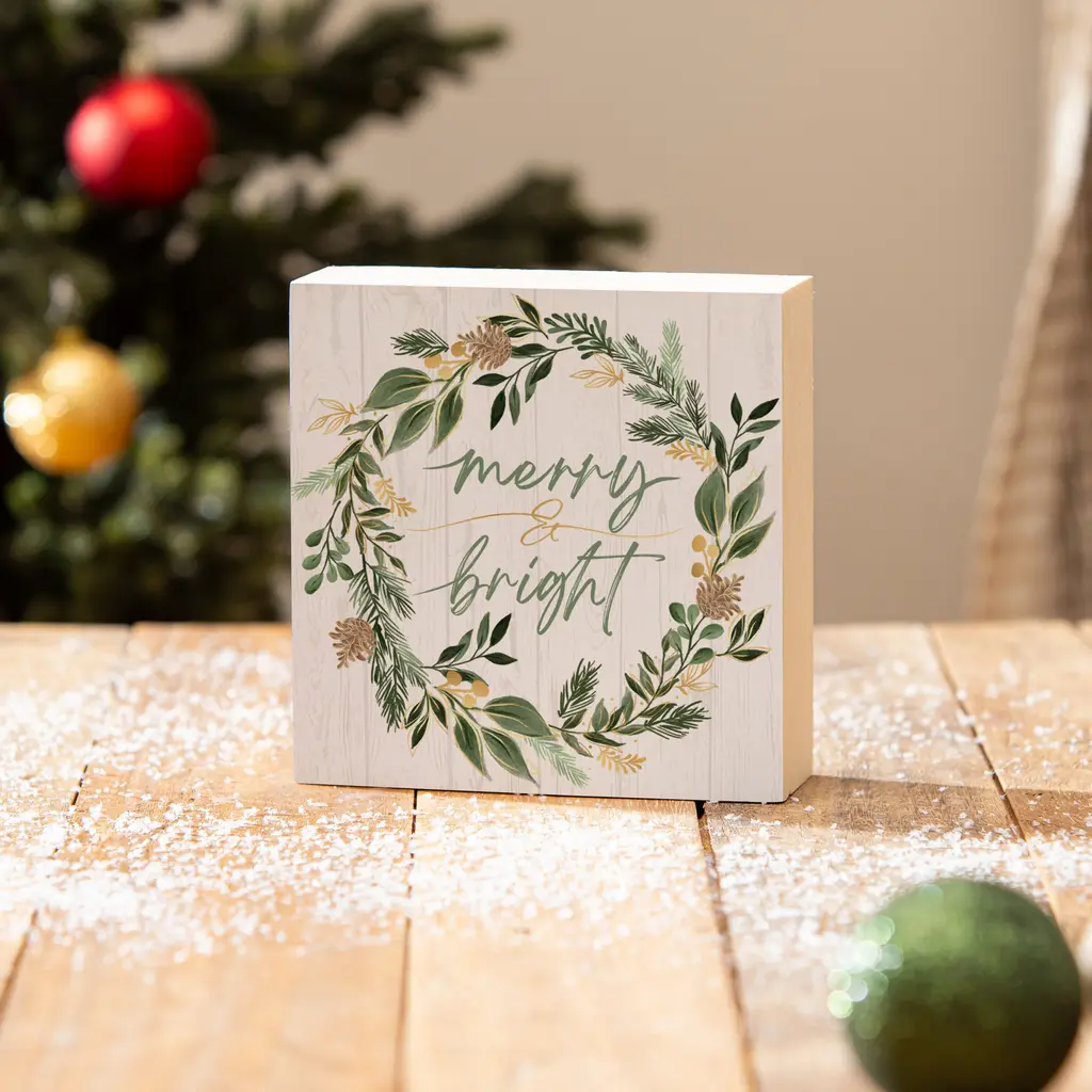 Shades Of Emerald Sign Wood Block, "Merry & Bright", 6"x6"