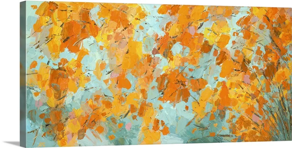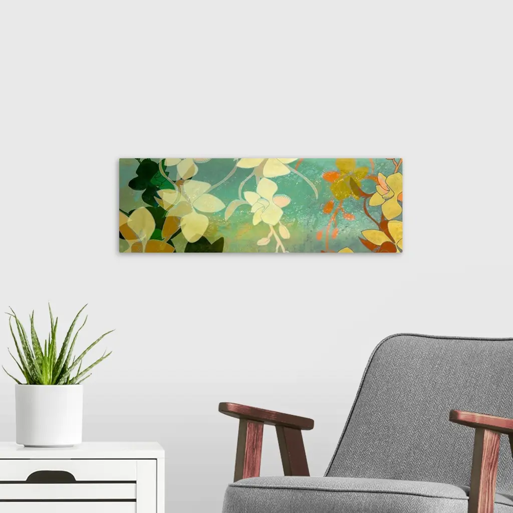 Big contemporary art shows different groups of flowers as they are layered on top of each other and create depth. Artist uses solid colors and minimal detail on the flowers.
