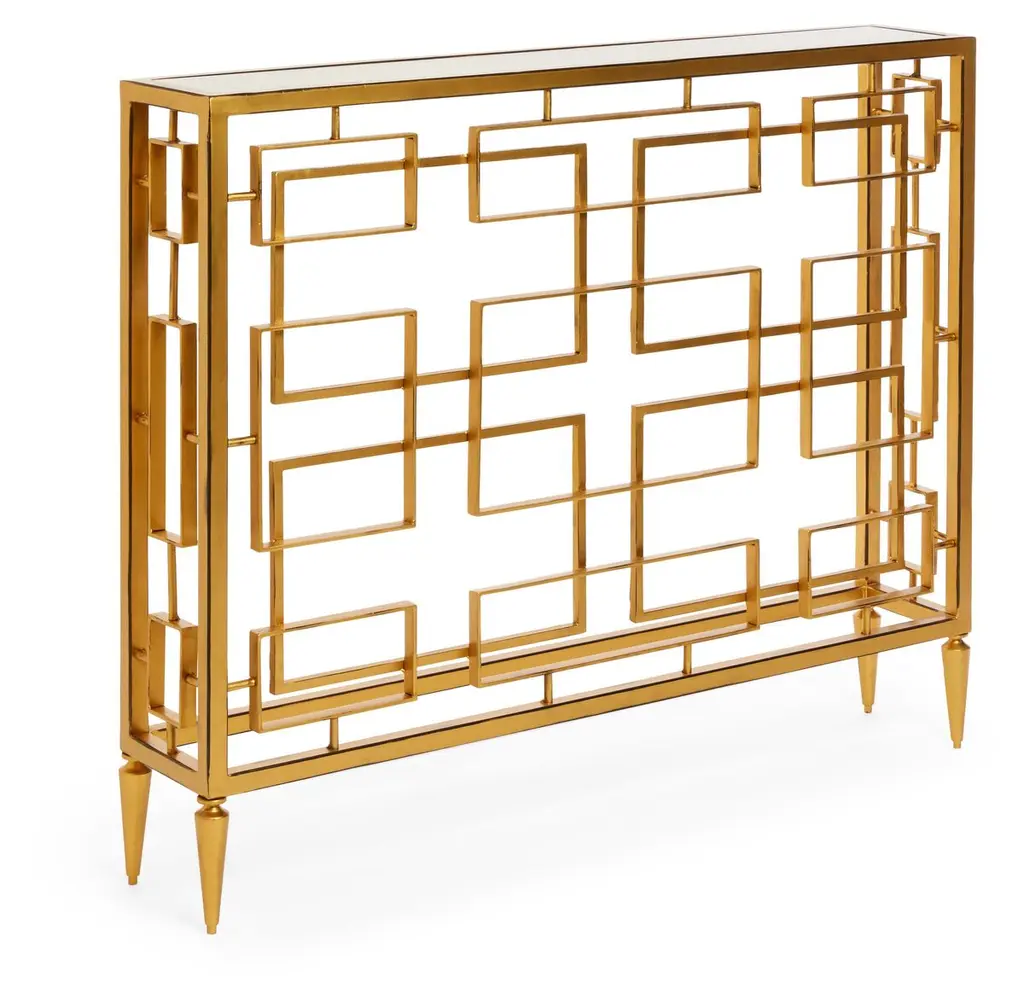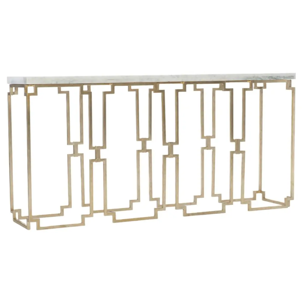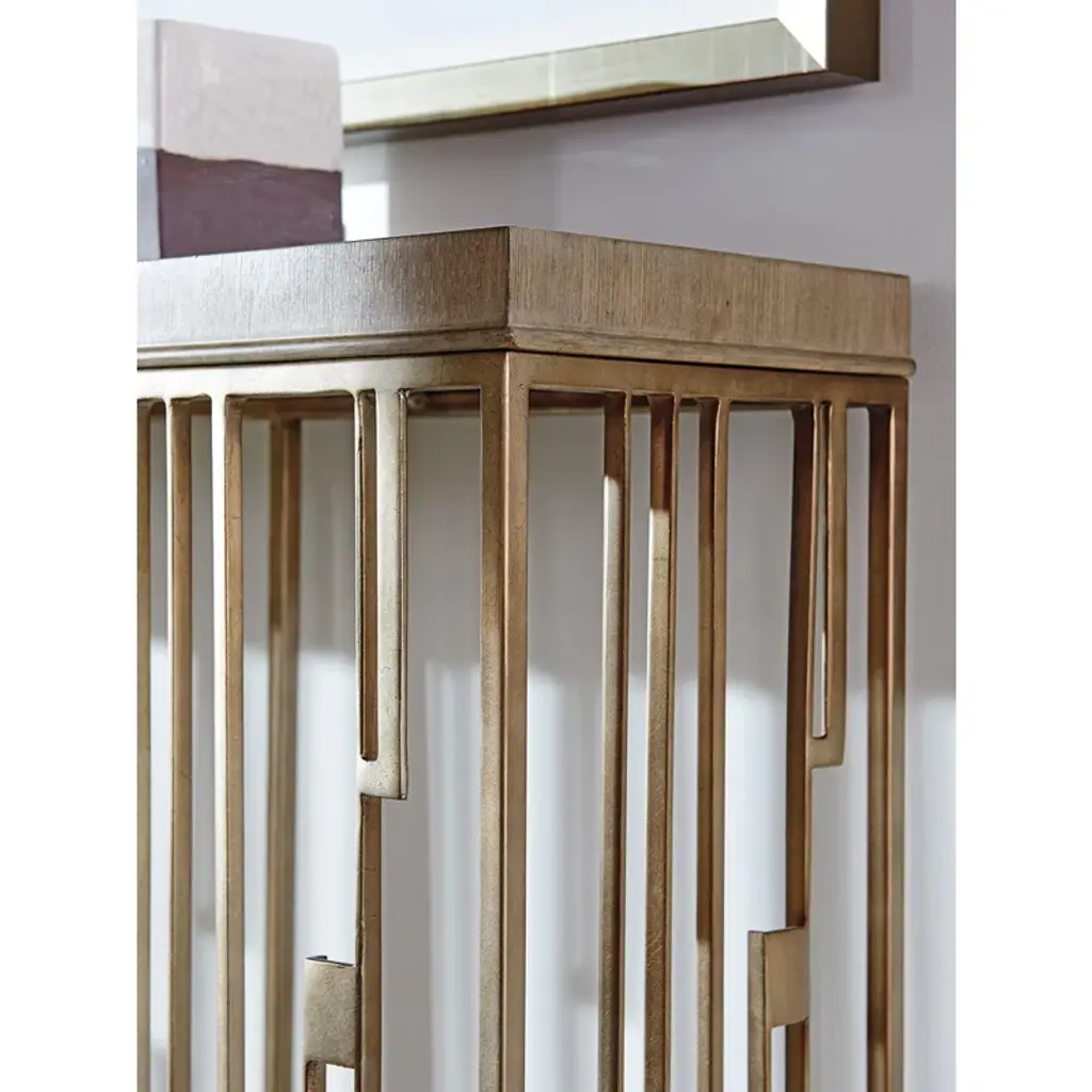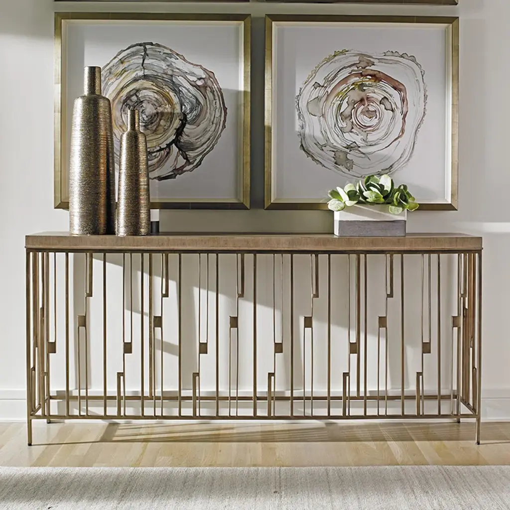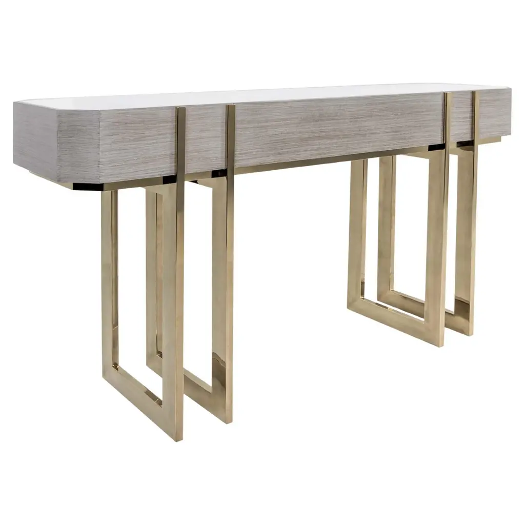 The console is a statement piece in the collection and a perfect design for the entry hall, dining room, or living area. The hand-forged metal base is finished in burnished silver leaf, with a top of the gray elm veneer.