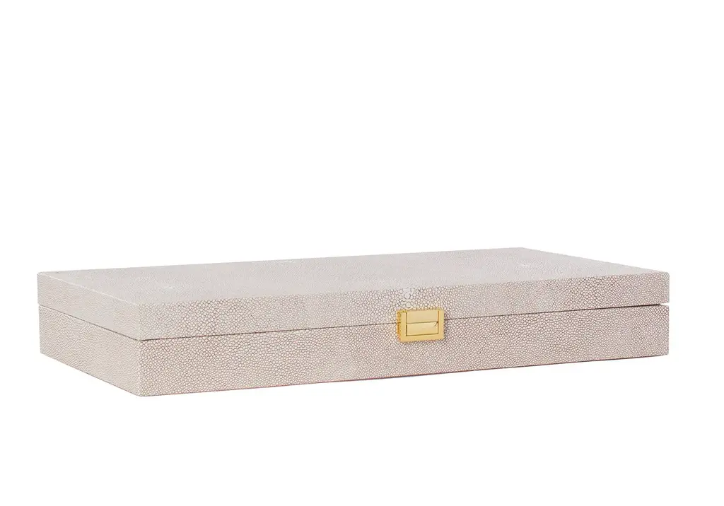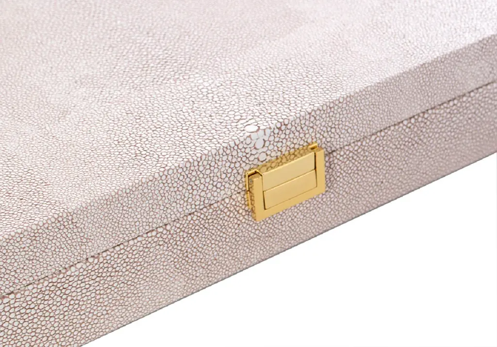 Final Sale Chic and graceful, this box lends a tasteful touch with its soft shell color and accentuating brass buckle. Its long, squared design and shagreen finish adds subtle texture. Available in three distinct sizes, mix and match together for a distinguished look. Each size sold separately.