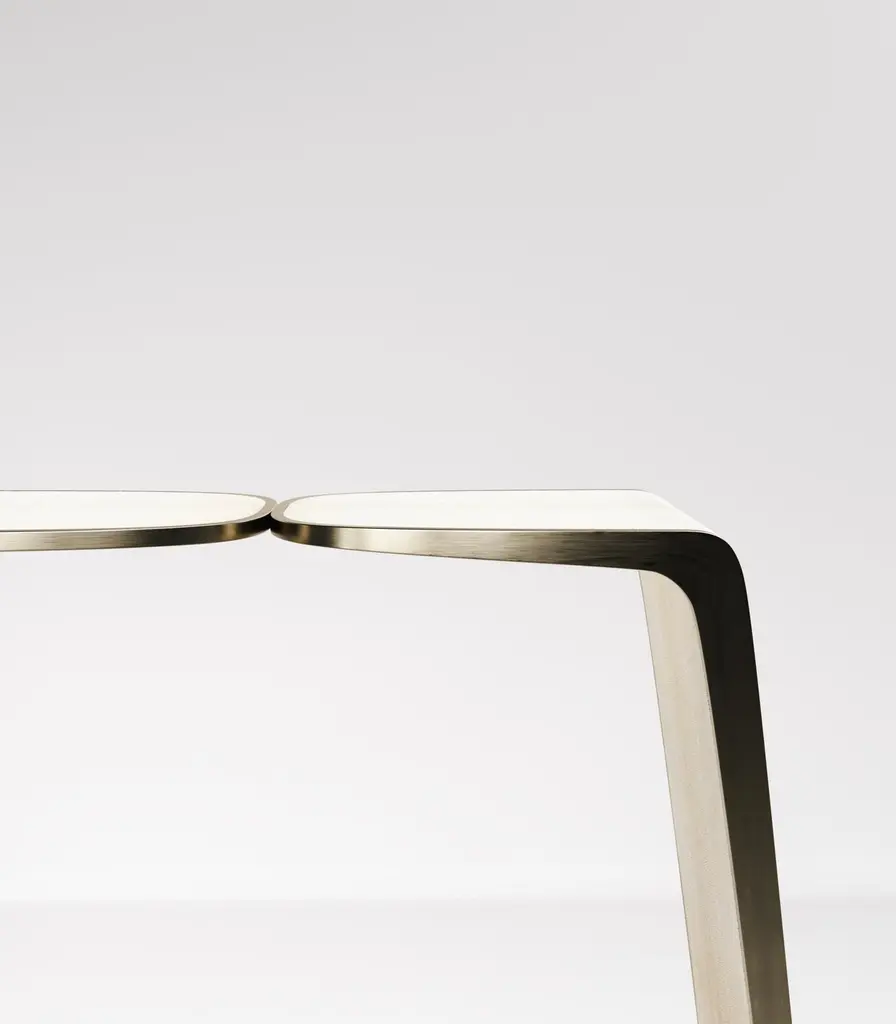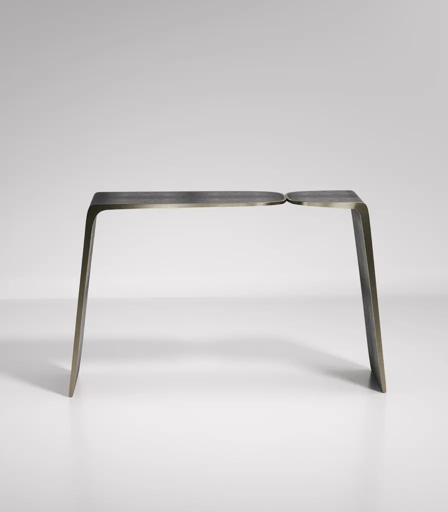 The Kiss Console by Kifu Paris is an elegant and organic piece in it's unique design. The coal black shagreen inlaid piece curves inwards to create the "kiss" effect. The borders are accentuated by bronze-patina brass. This piece is designed by Kifu Augousti the daughter of Ria and Yiouri Augousti. Available in other finishes. Part of the Kiss Capsule, see images of the collection at end of the slide.The finish of the shagreen is authentic as it is hand-dyed and the designer calls the finish look: "coal black shagreen."The dimensions of this piece are Depth 35 cm / Top Width 126.4 cm / Bottom Width 149.5 cm / Height 90 cmAll Kifu Paris pieces are handmade by artisans, ultimately making each piece unique.Custom color/sizing available on request.Wipe clean with soft dry cloth.Although inspired by her parents, her collection of Home Accessories and Furniture is a distinct identity of its own. Kifu uses handmade techniques of elaborate inlay patterns of shagreen, shells, semi-precious stones, materials she experienced as a child growing up in her parent’s studio, but interpreted in a younger quirkier way reflecting her youth. From her "jewelry inspired knobs" on decorative boxes, gold bar boxes and an extravagant inlay pattern mix of shagreen and shell inspired by galactic constellations, as seen on her enormous round mirror, is refreshing to see. Kifu embodies whimsical elements throughout her collection and is not afraid to be daring and unexpected in her approach to design.All shagreen-covered items should be kept out of direct sunlight, color variants may occur on the stingray and other exotic finishes, but this showcases the Parisian label's commitment to creating authentic luxurious products using natural components.