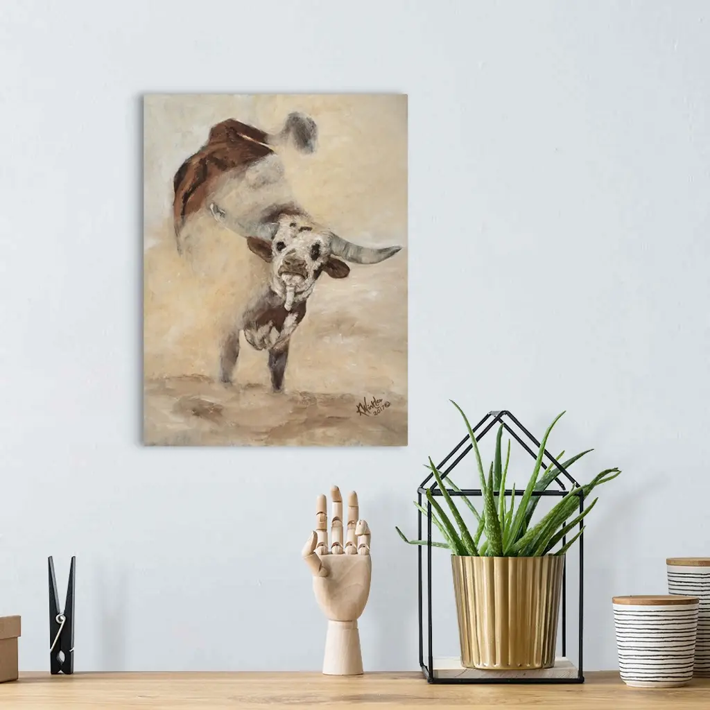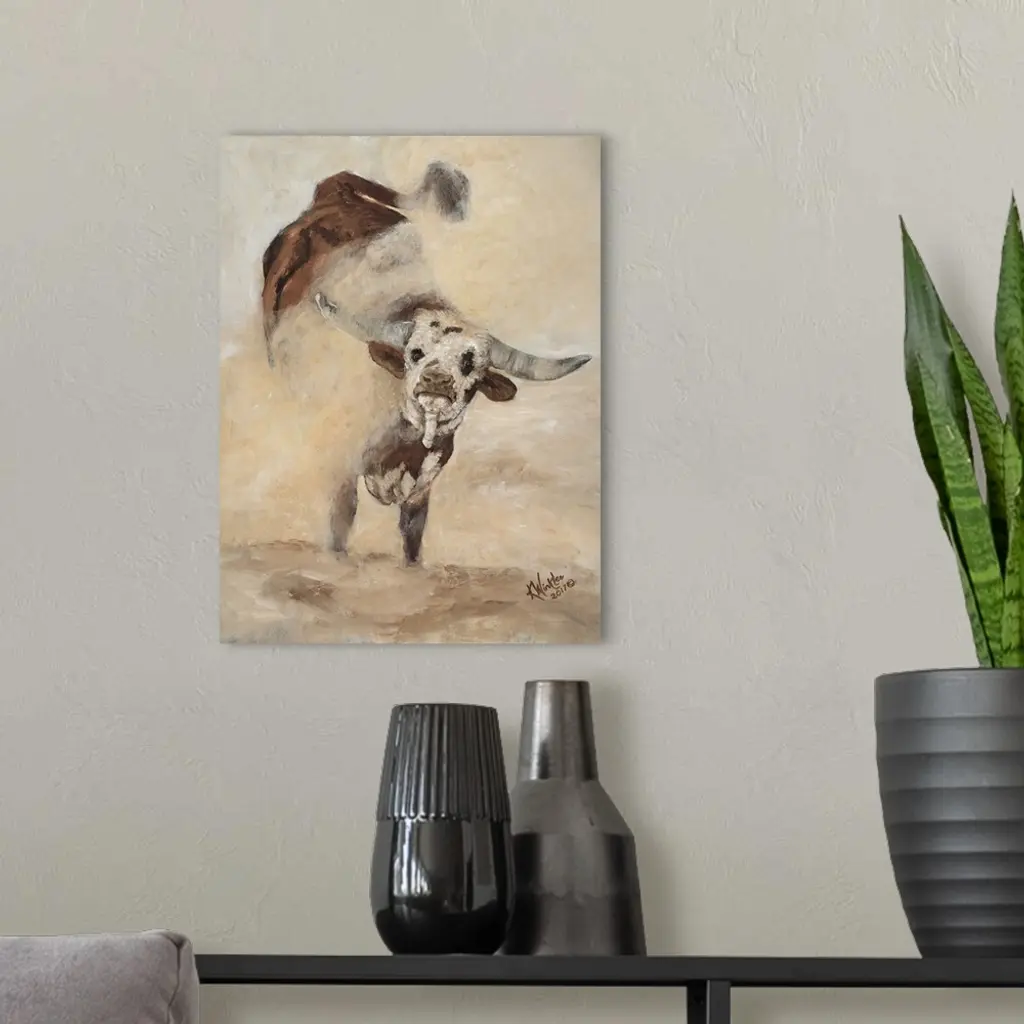 Energetic brush strokes and warm tones craft a longhorn cow kicking up dirt in a dusty landscape.