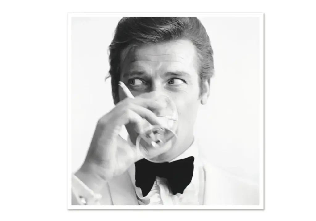 An iconic image, this photograph features English actor Roger Moore drinking a martini. Its classic black-and-white coloring further elevates its timeless image. Available framed or unframed, it effortlessly makes a statement in any space.