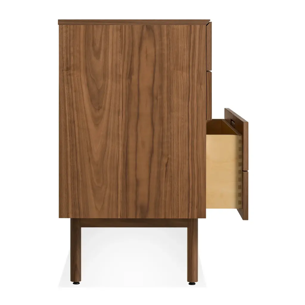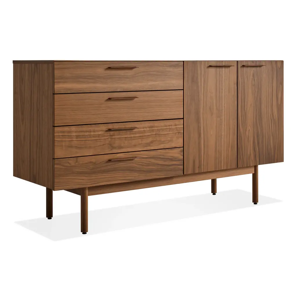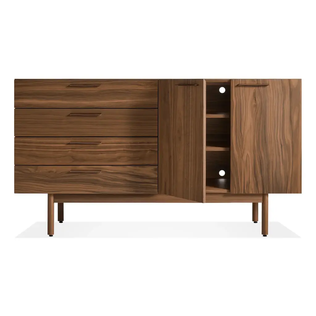 Layers of clean details. Warm wood and full grain leather pulls add storage panache and practicality to the living room or dining room. Door units feature adjustable shelves and wire management holes.Please note: Despite the fact that we call this a four drawer unit, it actually has only three drawers. I know, we are so silly. The bottom drawer is double height to accommodate more bulky items.