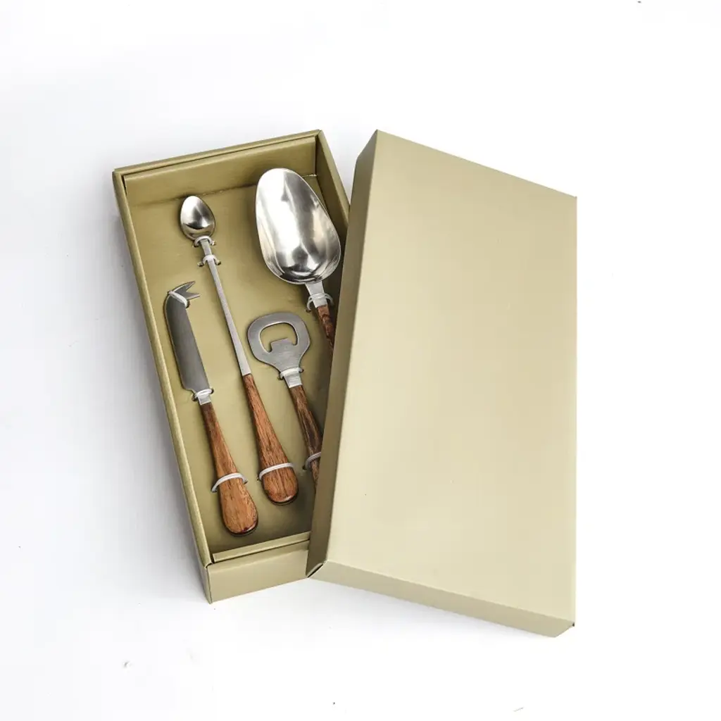 Made of stainless steel, with light acacia wood carved handles, our Shanice cocktail accessories are made by skilled artisans. A casual, and cool addition to your bar cart.