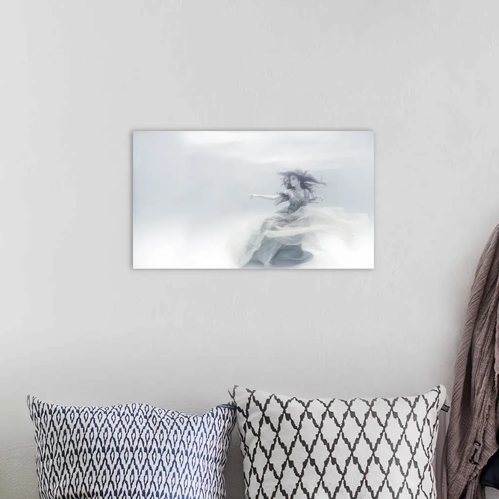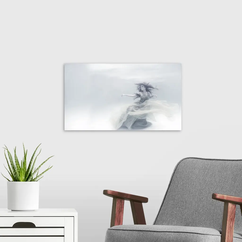 Underwater portrait of a woman in a flowing dress, in soft white light.
