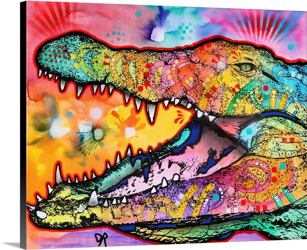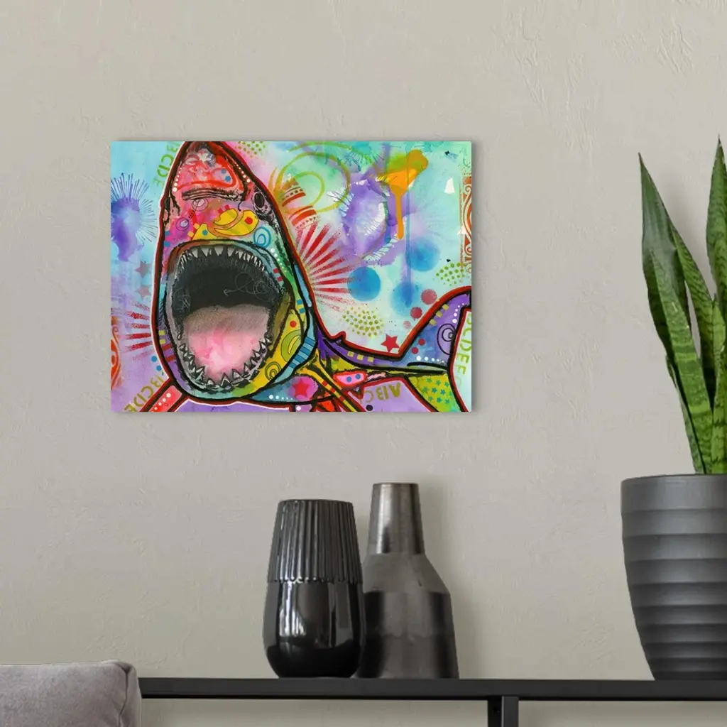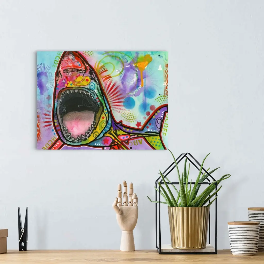 Playful illustration of a shark with its mouth wide open, made with different colors and fun designs.