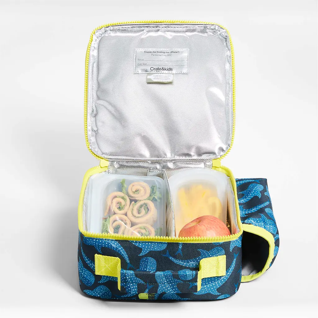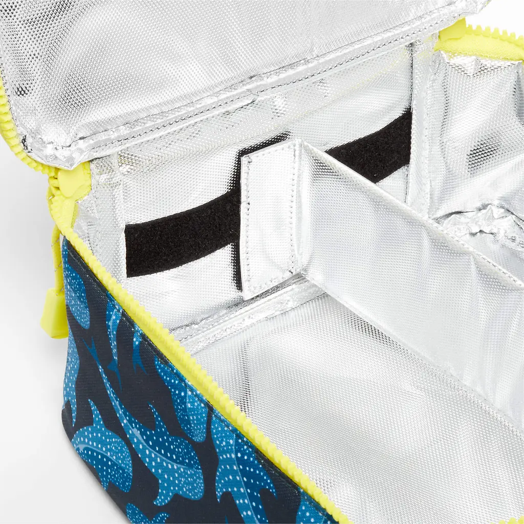 A fun and functional lunch box that's built to handle all the thrills and spills of the day. Spotted blue whale sharks and chartreuse green jellyfish swim over the dark blue sea of the exterior, and coordinating trim lights up the scene. Constructed of food-safe and supremely durable polyester made from recycled water bottles, our lightweight, easy-clean lunch box is roomy enough to hold multiple storage containers. Plus, it's insulated to keep meals just the way your kid likes them—hot, cold or somewhere in between. An outer pocket safely stows a napkin, utensils, daily reminder notes and more, and a designated water bottle pocket ensures their drink is always close at hand. Pair the shark lunch box with the matching backpack and water bottle to equip your little oceanographer for daily expeditions.