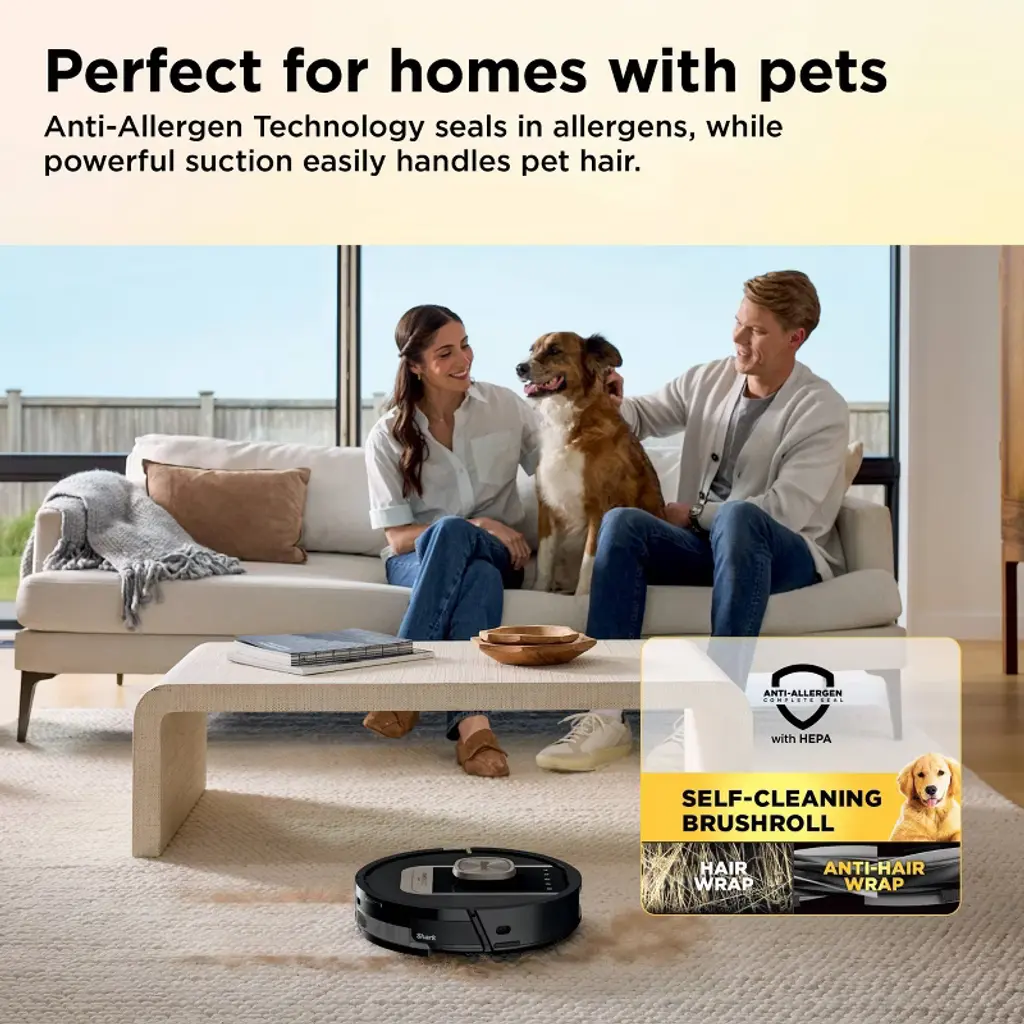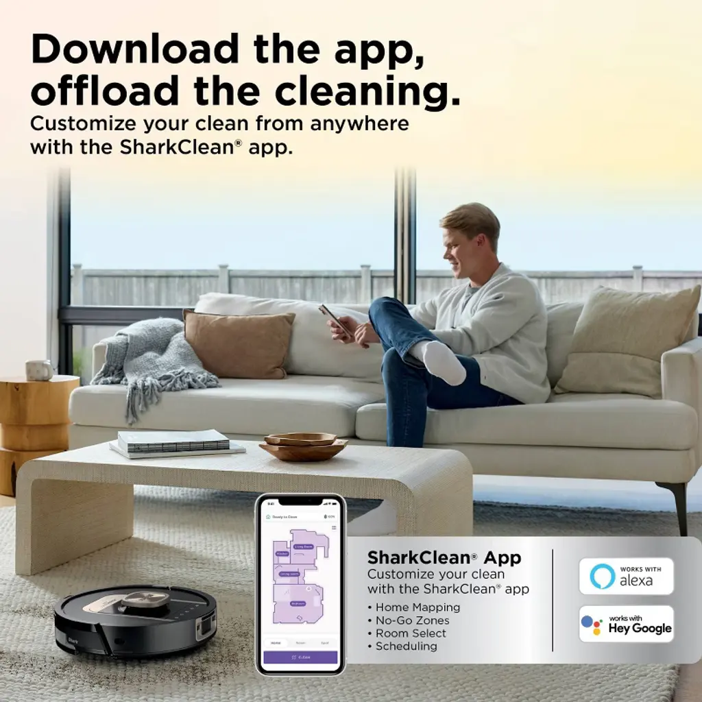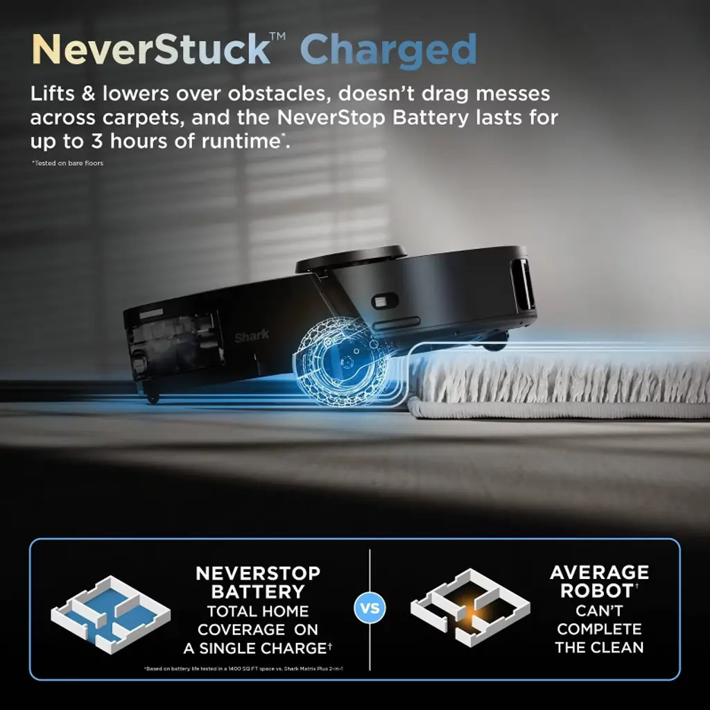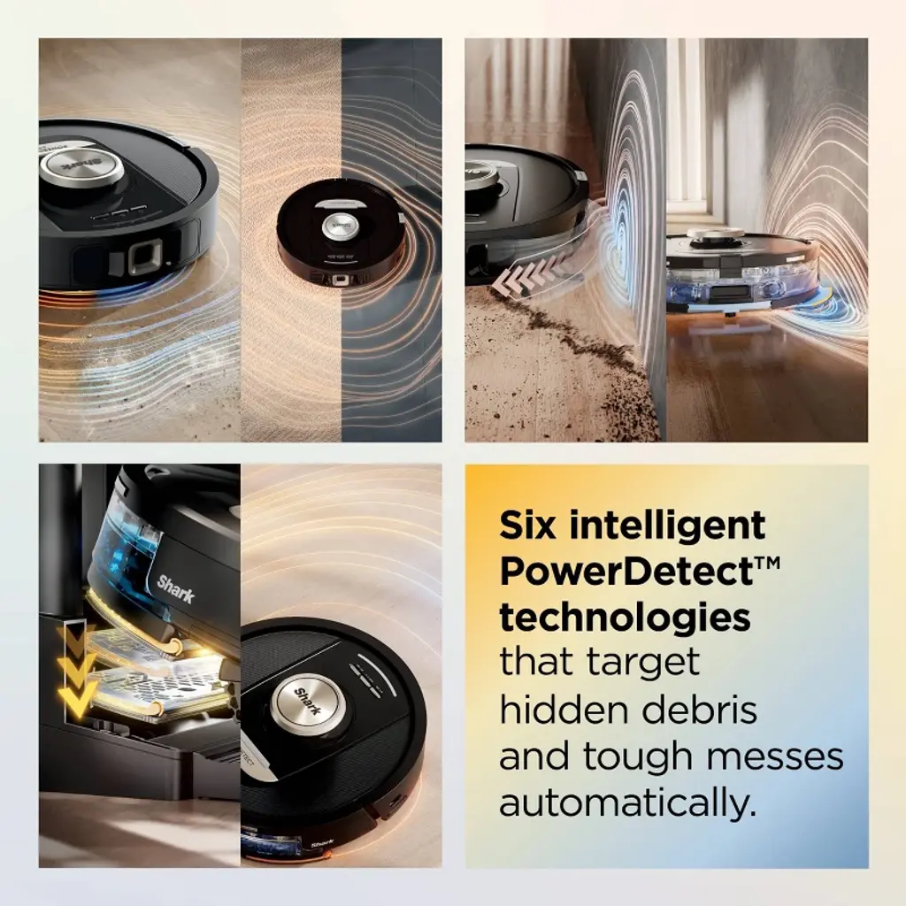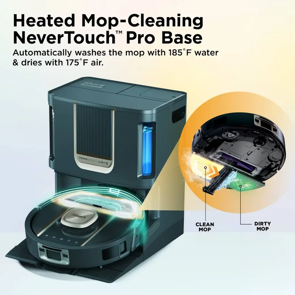 Experience up to a month of hands-free cleaning with the Shark ® PowerDetect™ ThermaCharged™ 2-in 1 Robot vacuum and Mop. Its NeverTouch™ Pro Base washes the mop with 185°F water, dries with 175°F air, and empties debris automatically. With Dirt Detect, edge-to-edge cleaning, Neverstuck charged technology, and DryGuard™ protection, it delivers nonstop, deep-cleaning performance.