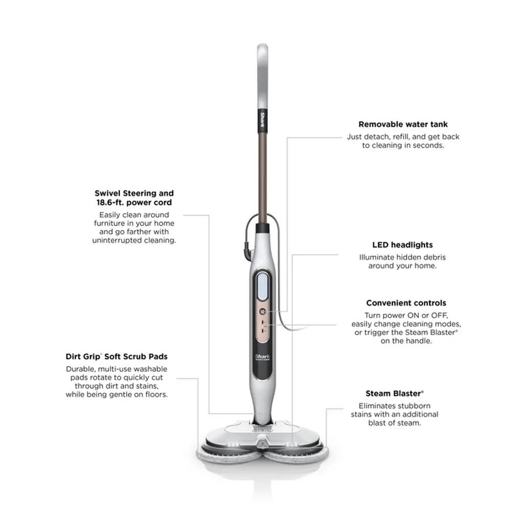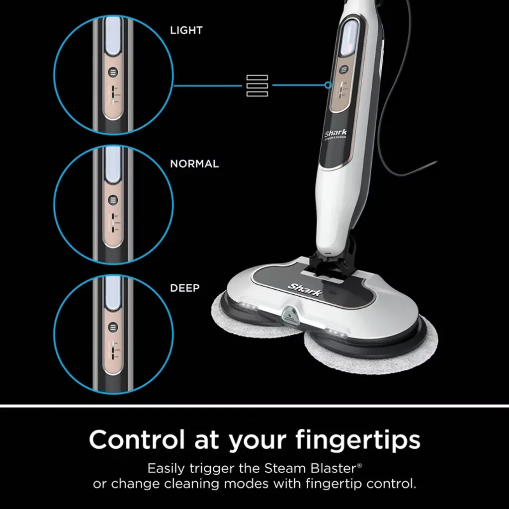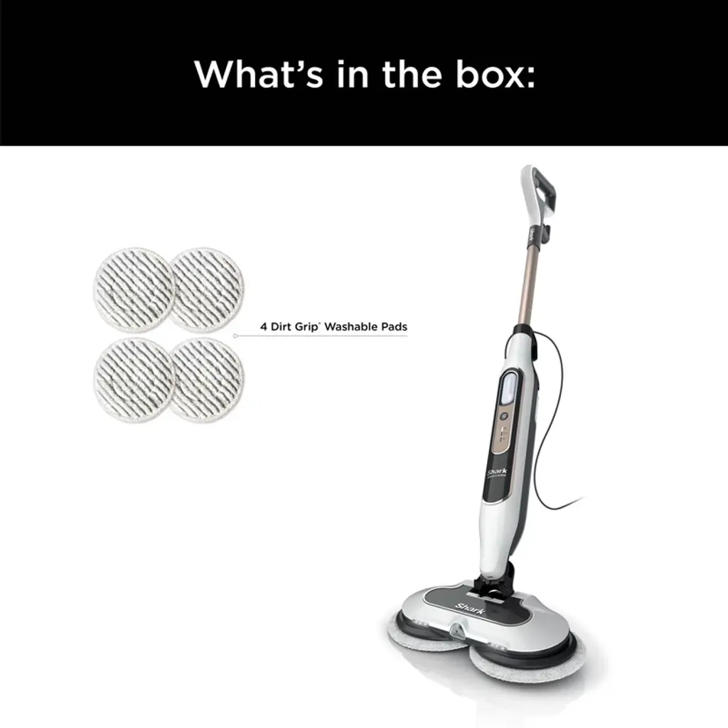 The Shark® Steam & Scrub with Steam Blaster® Technology scrubbing and sanitizing* steam mop gently scrubs and sanitizes* all at once. The combination of steam and rotating pads delivers up to 2x better stuck-on stain removal vs. traditional steam mops** while providing chemical-free sanitization*.