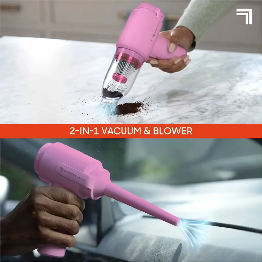 The Sharper Image® Dual Air Cordless Vacuum & Blower is a portable 2-in-1 device that makes quick cleanups easier than ever. Switch between strong suction to pick up debris and air-blowing mode to dust keyboards, vents, car interiors, or inflate small items. With multiple attachments included, it’s ideal for reaching tight spaces at home, at work, or on the go.The rechargeable battery provides up to 15 minutes of use on a full charge, and the lightweight build makes it easy to store or carry wherever you need it. Whether you're tidying your desk or cleaning out a keyboard, this compact tool offers efficient, cordless convenience.