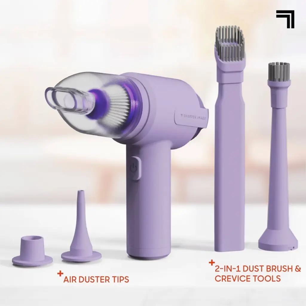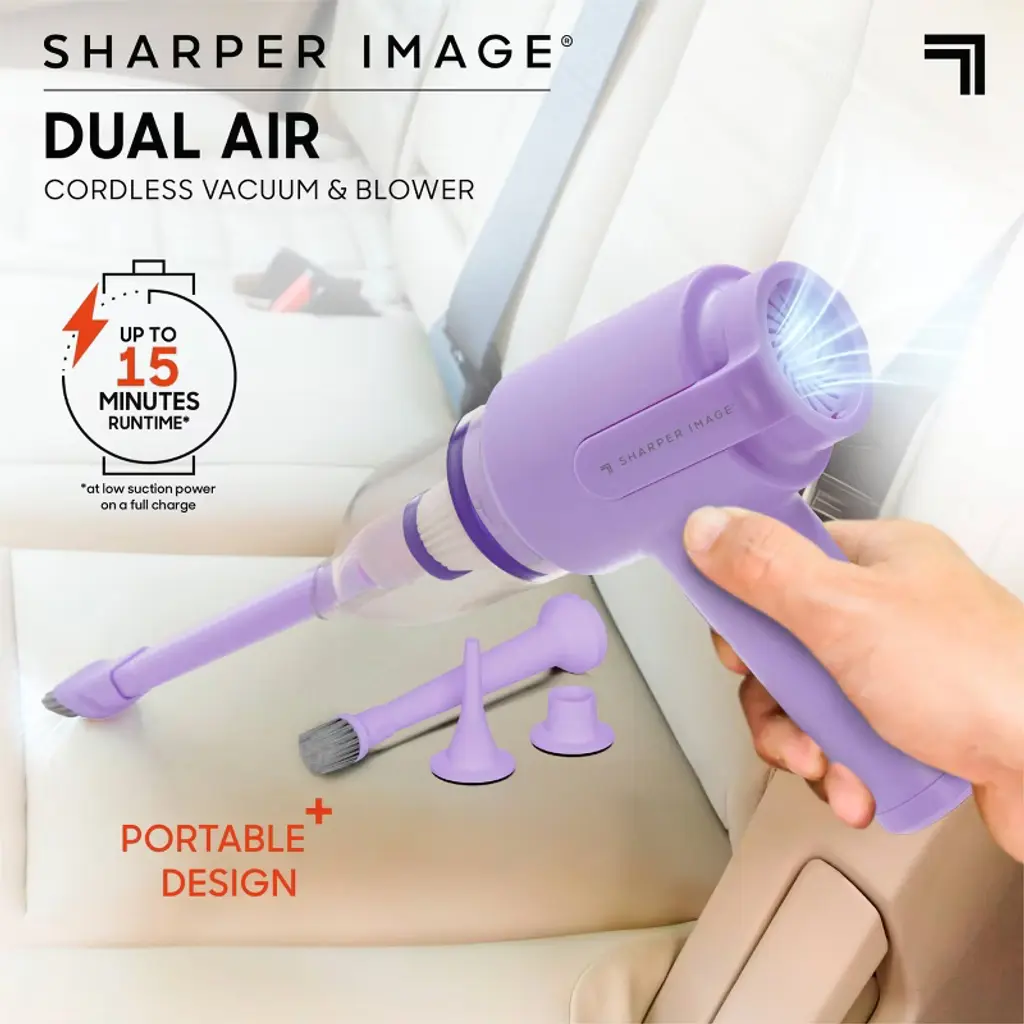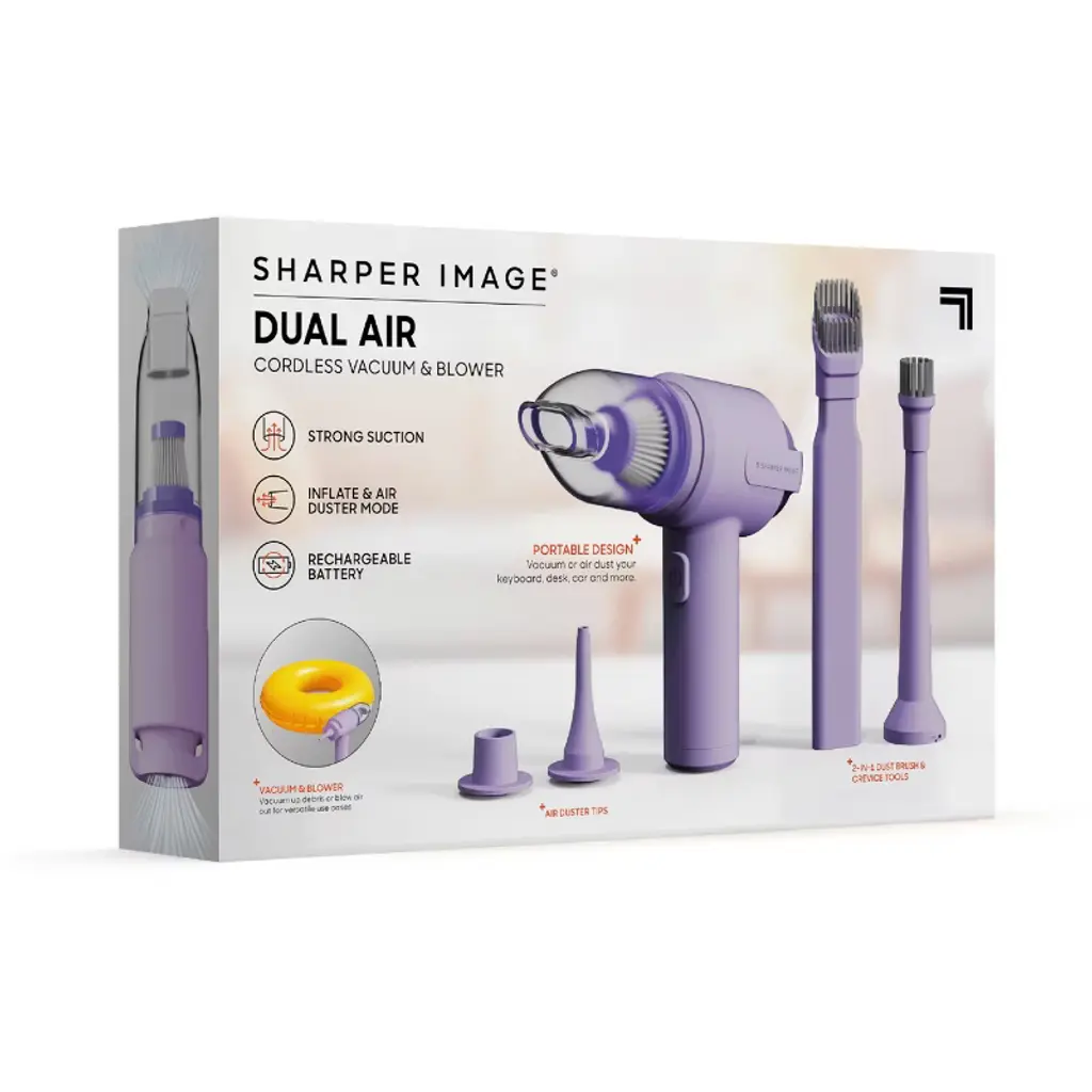The Sharper Image® Dual Air Cordless Vacuum & Blower is a portable 2-in-1 device that makes quick cleanups easier than ever. Switch between strong suction to pick up debris and air-blowing mode to dust keyboards, vents, car interiors, or inflate small items. With multiple attachments included, it’s ideal for reaching tight spaces at home, at work, or on the go.The rechargeable battery provides up to 15 minutes of use on a full charge, and the lightweight build makes it easy to store or carry wherever you need it. Whether you're tidying your desk or cleaning out a keyboard, this compact tool offers efficient, cordless convenience.