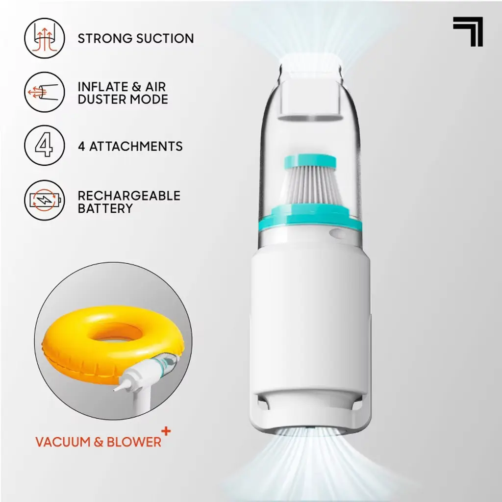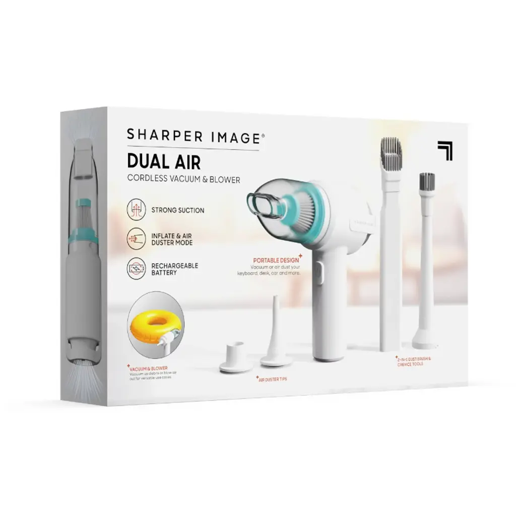The Sharper Image® Dual Air Cordless Vacuum & Blower is a portable 2-in-1 device that makes quick cleanups easier than ever. Switch between strong suction to pick up debris and air-blowing mode to dust keyboards, vents, car interiors, or inflate small items. With multiple attachments included, it’s ideal for reaching tight spaces at home, at work, or on the go.The rechargeable battery provides up to 15 minutes of use on a full charge, and the lightweight build makes it easy to store or carry wherever you need it. Whether you're tidying your desk or cleaning out a keyboard, this compact tool offers efficient, cordless convenience.