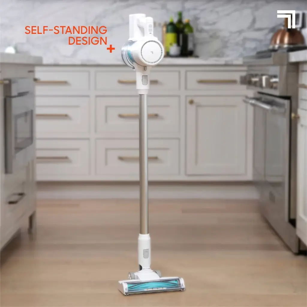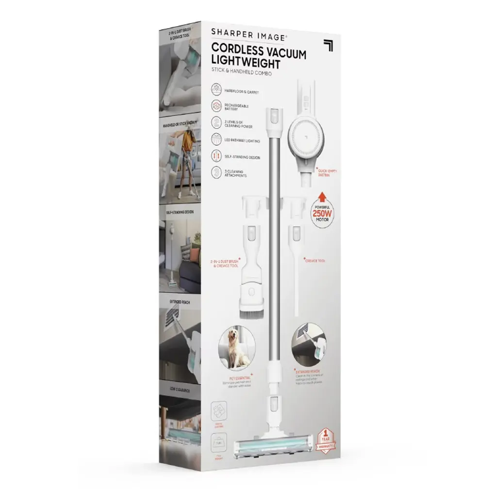 The Sharper Image® Cordless Vacuum Lightweight Stick & Handheld Combo offers powerful, flexible cleaning for every corner of your home. Use it as a full-length stick vacuum for floors or detach the handheld unit for couches, stairs, and cars. The lightweight design and extended reach make it easy to clean overhead areas like vents and ceiling corners.This vacuum features two suction modes to handle both hard floors and carpets, plus LED pathway lights to help you spot hidden dust and debris. A self-standing frame and included wall mount provide multiple storage options, while the washable HEPA filter captures fine particles for a cleaner, healthier home.