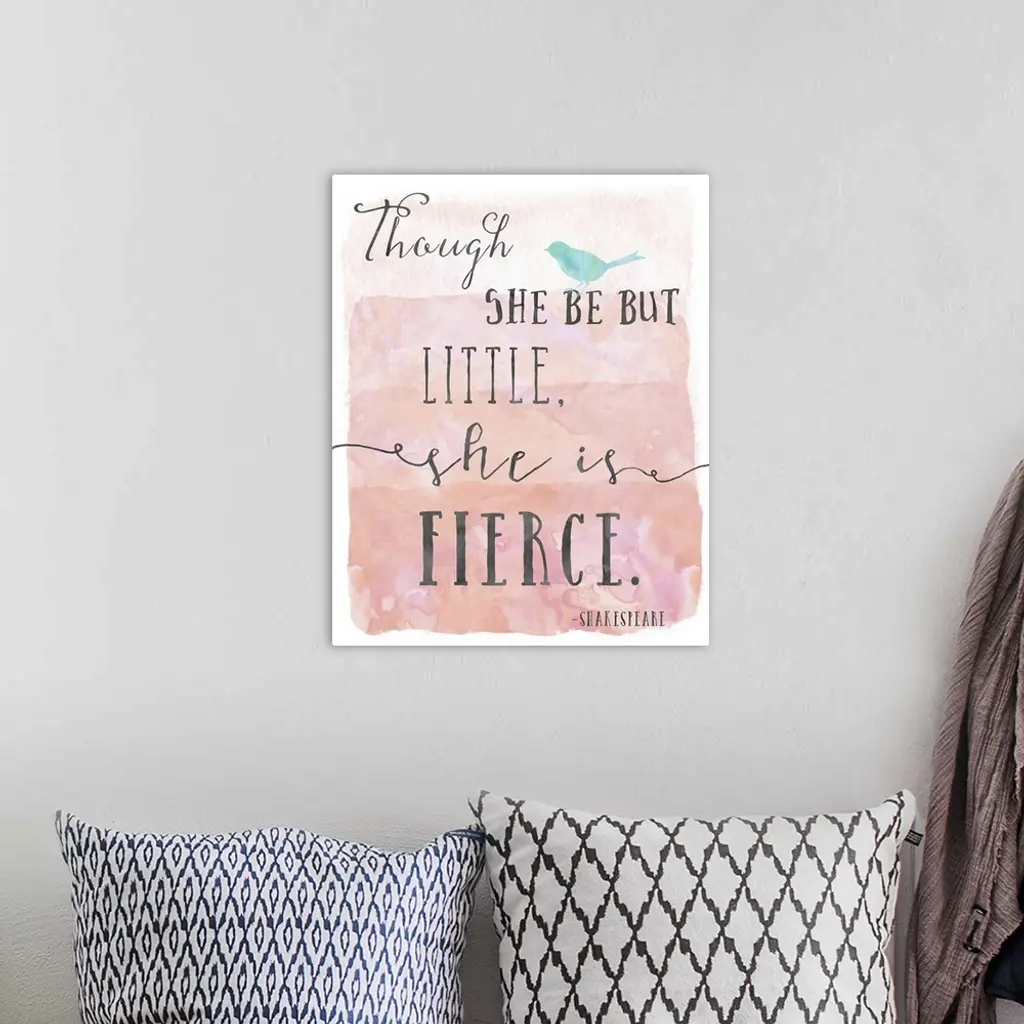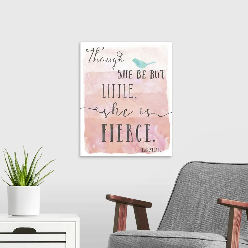 "Though she be but little, she is fierce" handwritten on a pink watercolor background with a small blue bird.