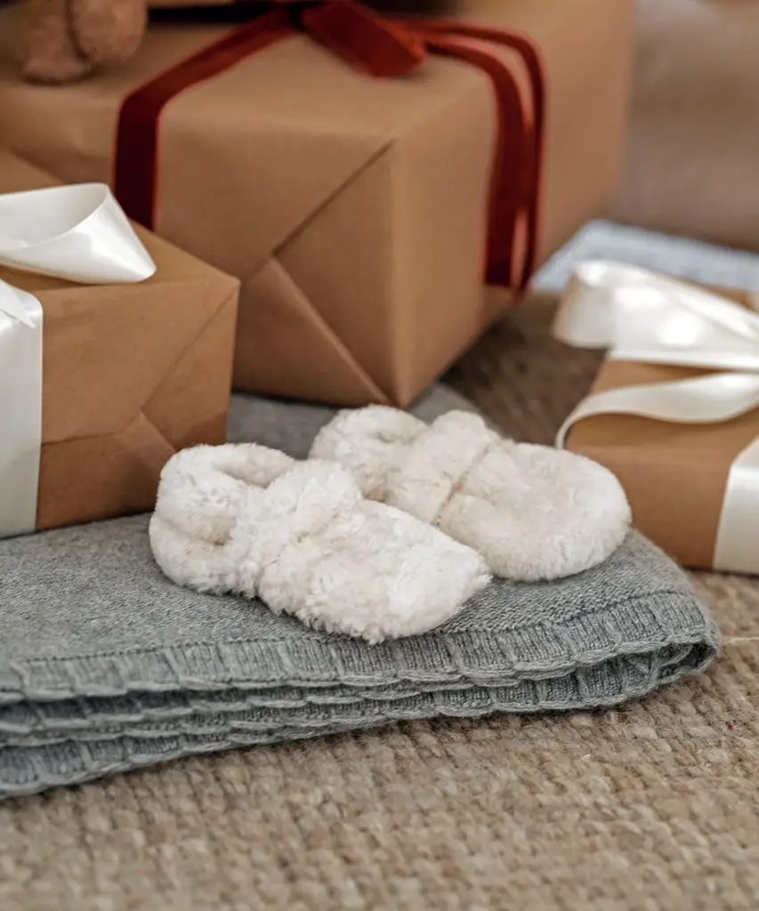 Shearling Baby Booties Ivory Fully lined in the softest shearling for a cozy, cuddly bootie for your little one. 100% shearling. Made in Los Angeles. Baby booties feature elastic at the ankle to ensure they don't fall off your little one's feet.