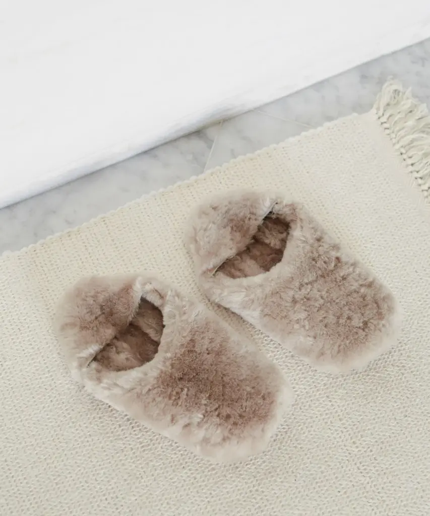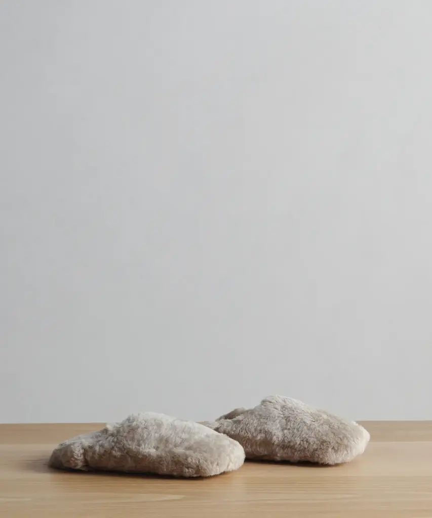 Shearling Moroccan Slipper Smoke Moroccan-style slippers with shearling-lined upper and suede outsole. Made in Turkey. Like traditional Moroccan styles, the back heel folds down and flips up to cover the heels.