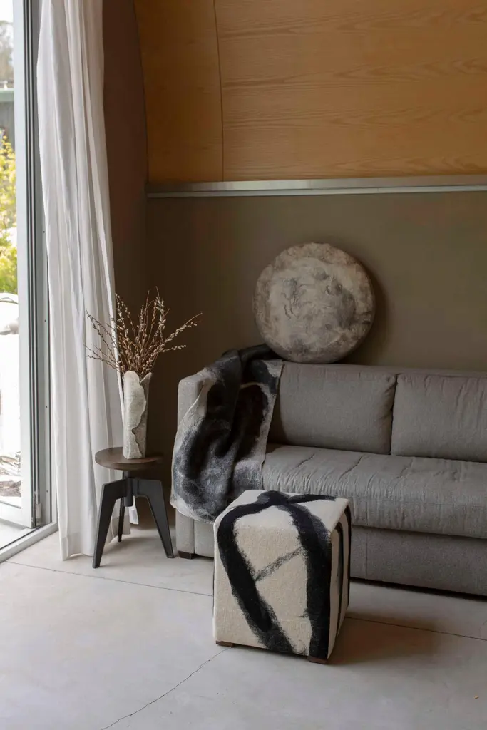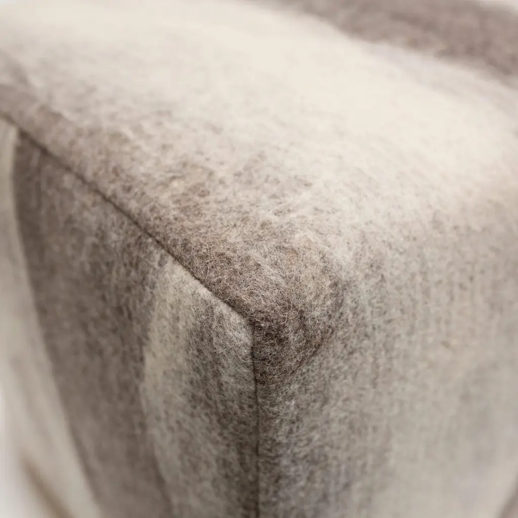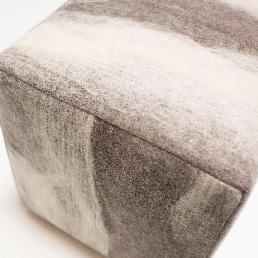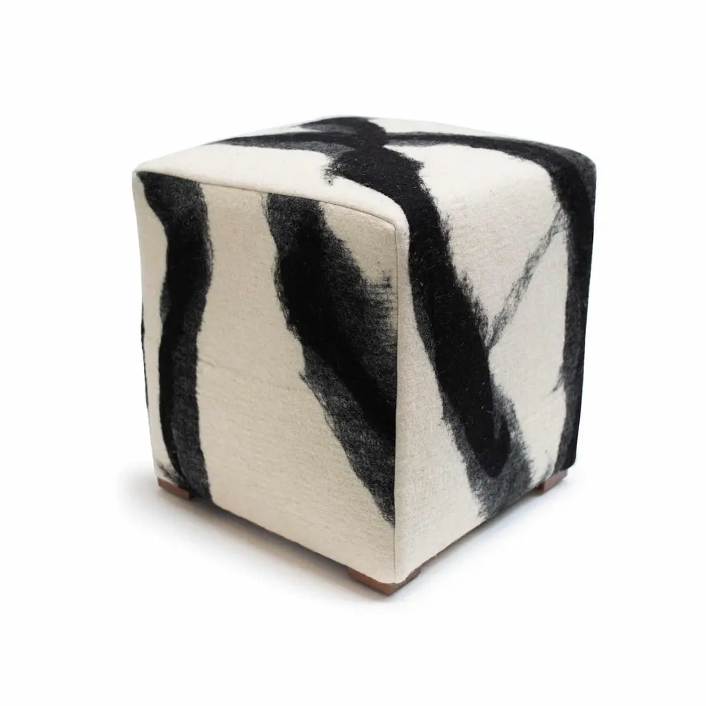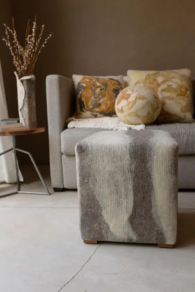 Felted wool fabric made in our workshop, each one one-of-a-kind from our painterly felted wool over a finely upholstered ottoman with wood legs.The ottoman is manufactured in Portland, Oregon USA by an accomplished fine furniture builder for many years. Attention to the detail of the fabric as it stretches over one full side to enhance our design is an added touch. Dimensions: 17 x 17" cube with padded comfort seat. Not meant as a tray holder, as seat is meant for comfort.Care: Spot clean, do not steam clean.