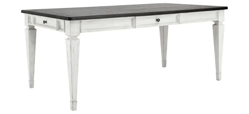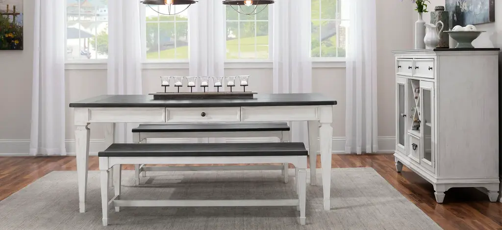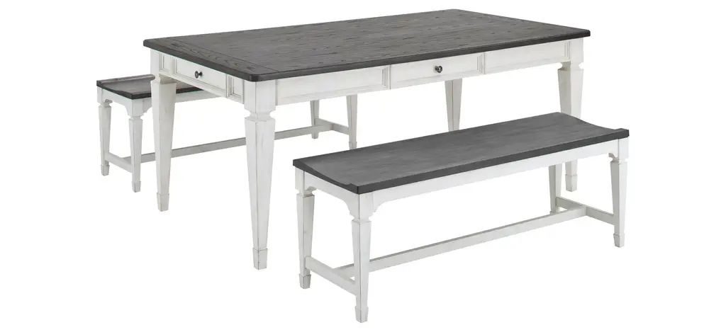 Dynamically different, the 3-pc. Shelby dining room collection is sure to make a statement. Visibly contrasting black and white colors draw the eyes and cast a dramatic shadow. It still manages to keep a casual air though with its welcoming wood tones. Not only does Shelby look great, this collection also offers plenty of functionally. The dining table has four drawers for extra storage.
