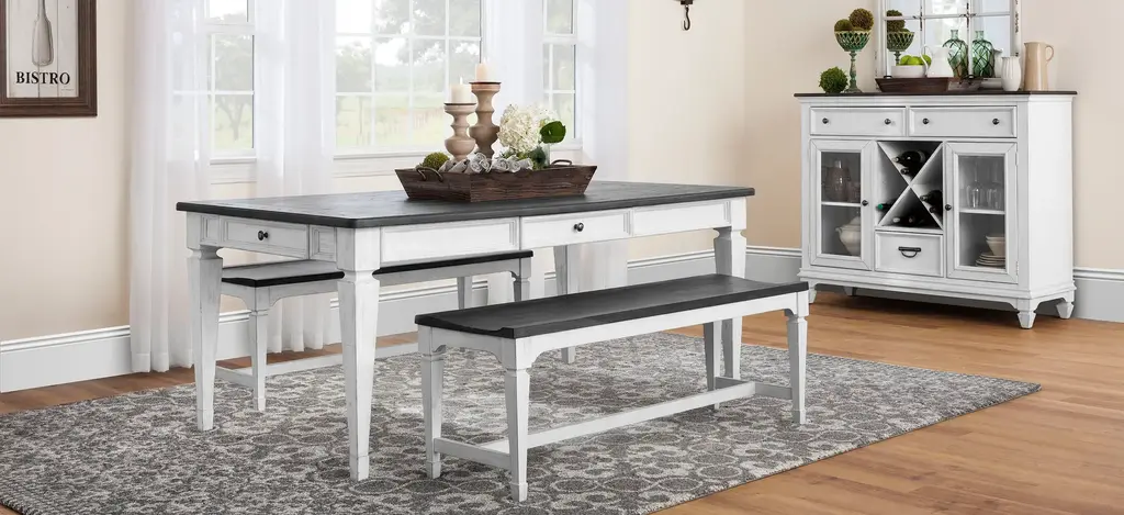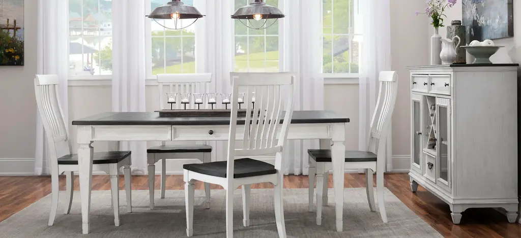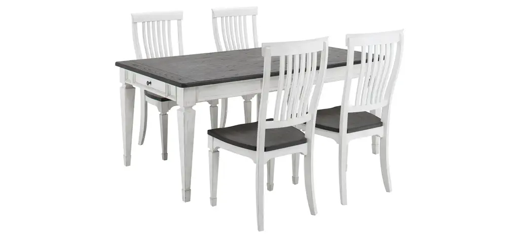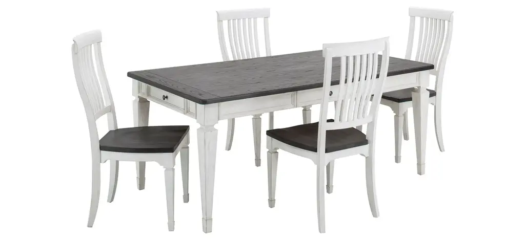 Dynamically different, the 5-pc. Shelby dining room collection is sure to make a statement. Visibly contrasting black and white colors draw the eyes and cast a dramatic shadow. It still manages to keep a casual air though with its welcoming wood tones. Not only does Shelby look great, this collection also offers plenty of functionally. The dining table has four drawers for extra storage.