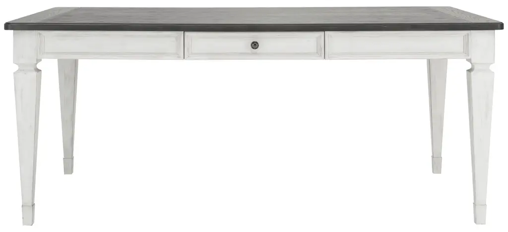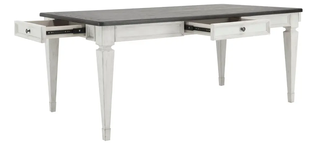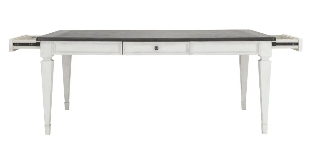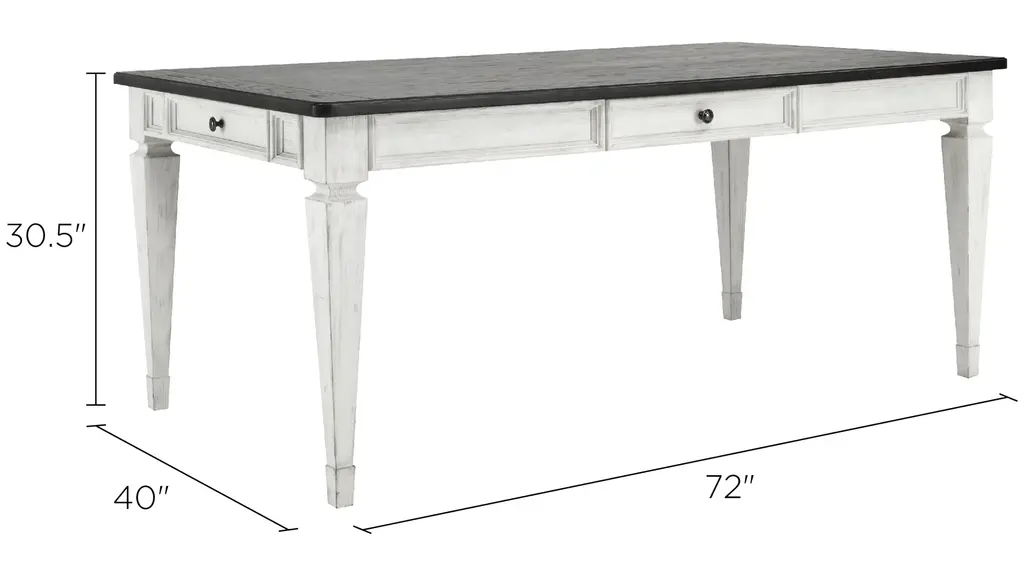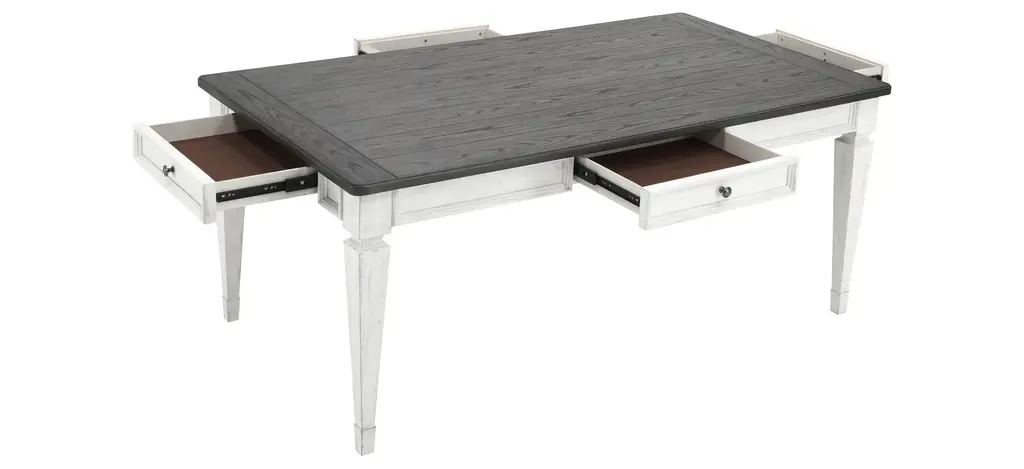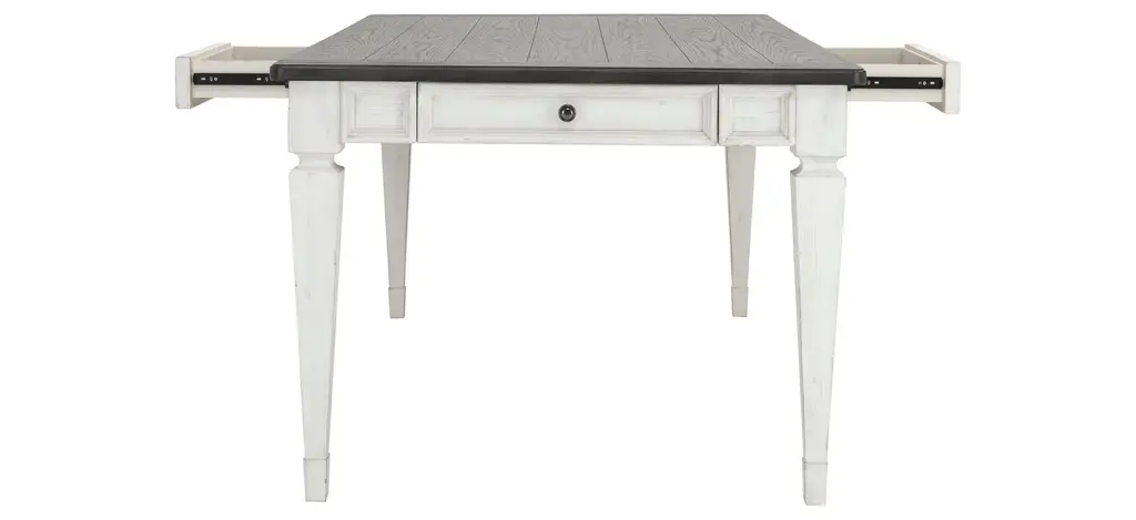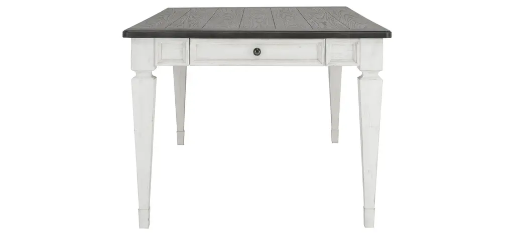 Dynamically different, the Shelby dining table is sure to make a statement. Visibly contrasting black and white colors draw the eyes and cast a dramatic shadow. It still manages to keep a casual air though with its welcoming wood tones. Not only does Shelby look great, this table also offers plenty of functionally with four drawers.