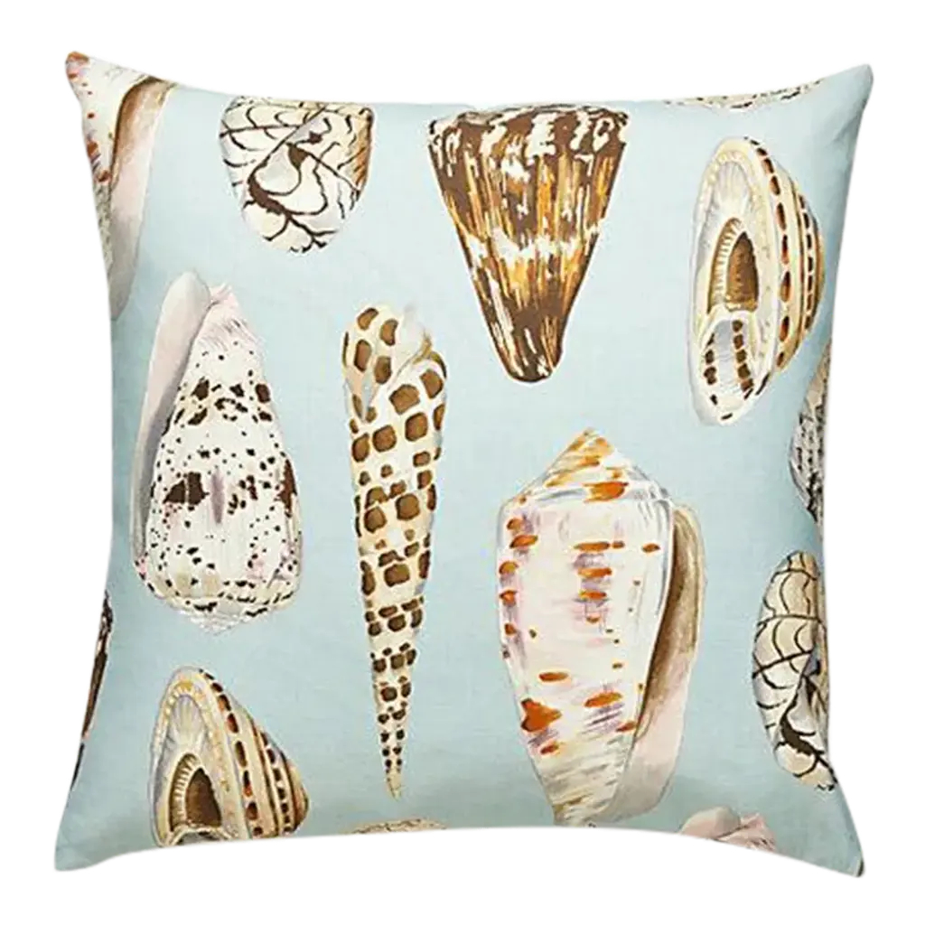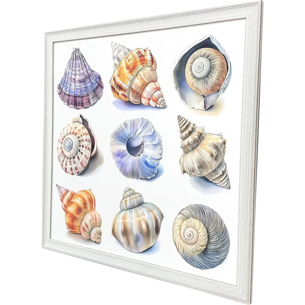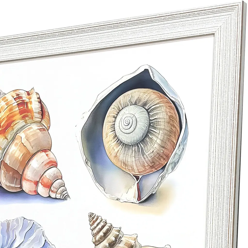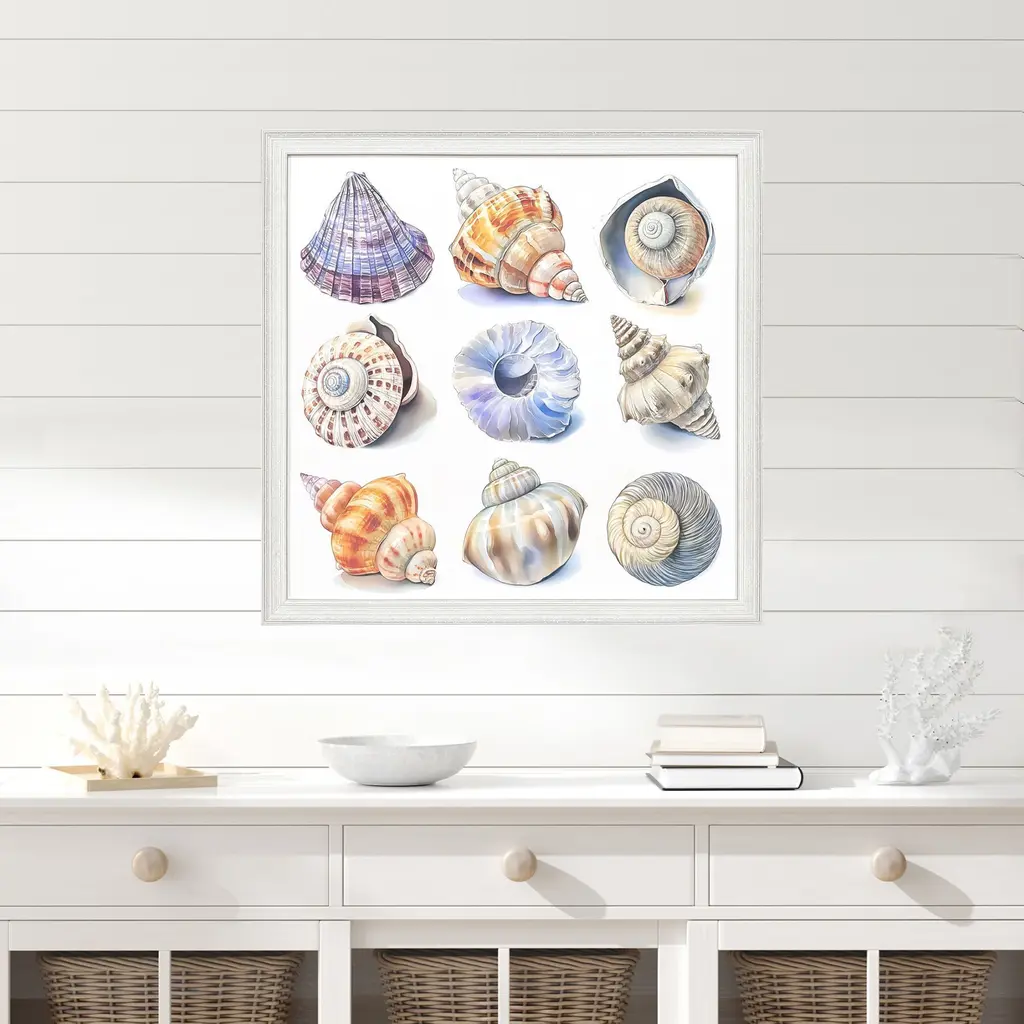A coastal giclee features a variety of ocean seashells in varying colors. Framed to the image in a whitewash distressed wood with ribbed face.
