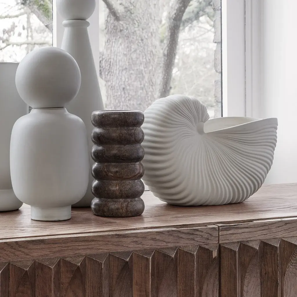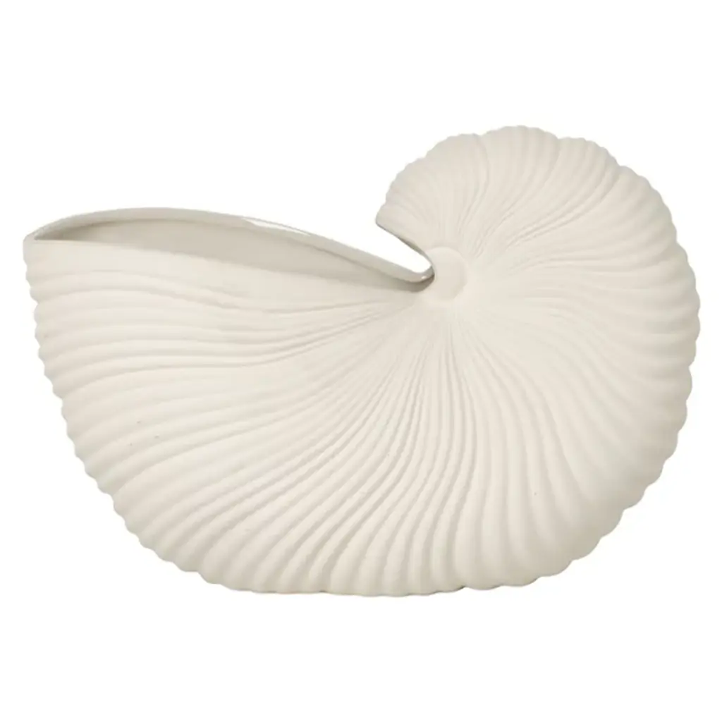 Filled with your favorite flowers or by its own, this pot shaped like a nautilus shell merges natural shapes with contemporary design. With a matte outside and glazed inside, it adds delicate detail to any room, simple and sculptural all at once.