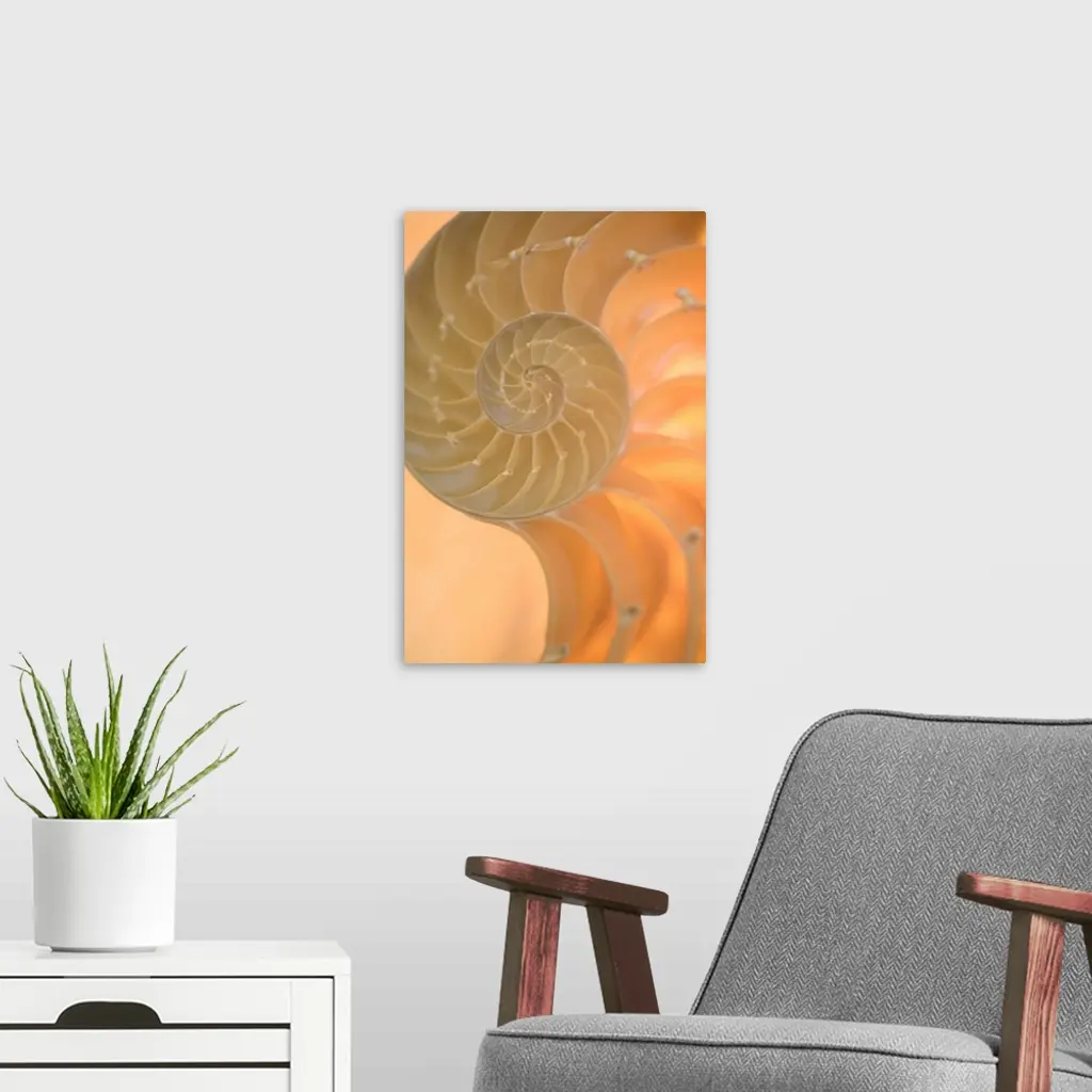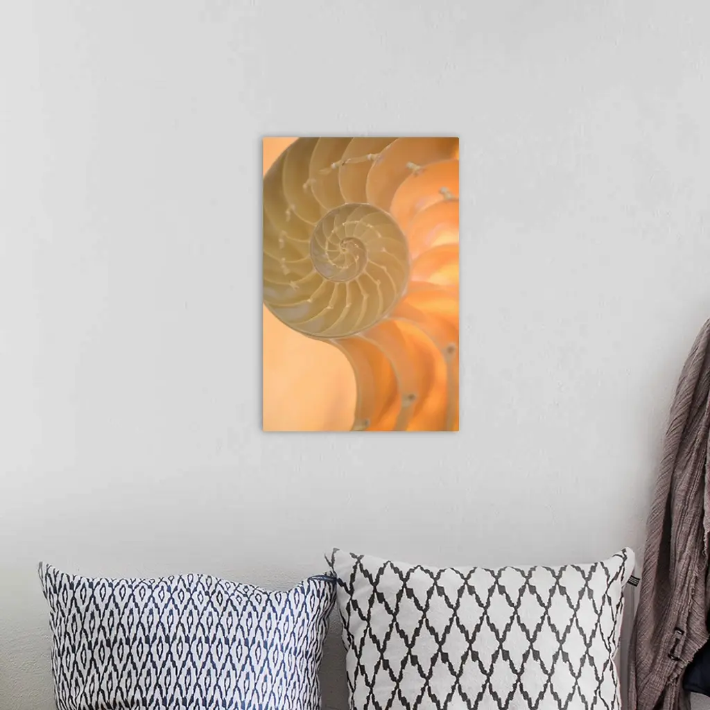 A contemporary close-up of a nautilus shell rendered in glowing neutral tones.