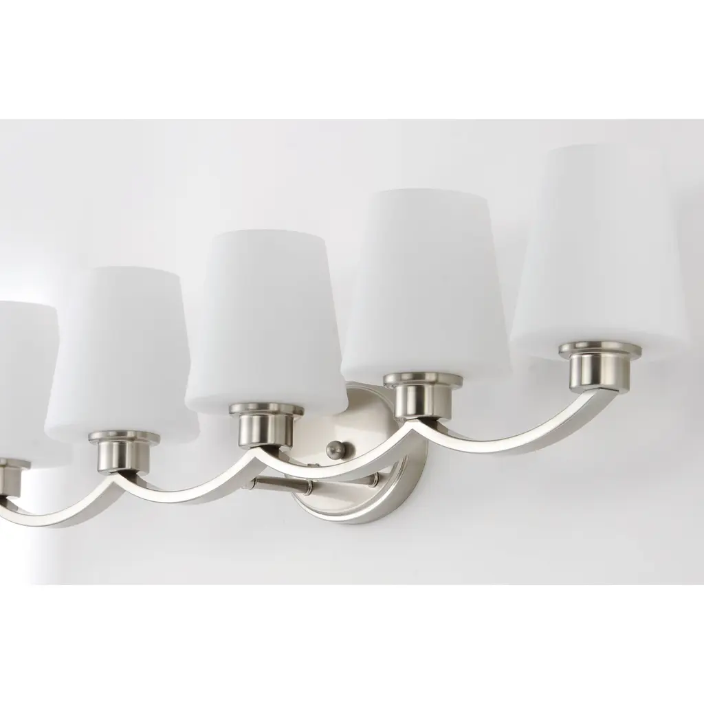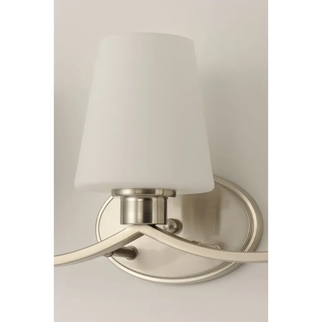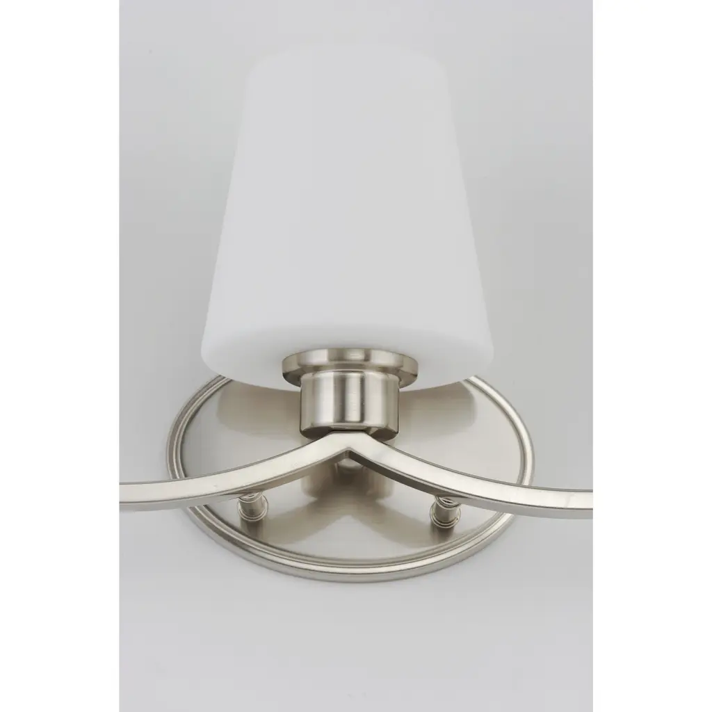 Graceful arcs of rectangular tubing transition to round cups that support tapered Satin White glass shades creating a crisp and clean transitional design. The frame is finished in your choice of Satin Nickel or Black which bridges modern and transitional design aesthetics.