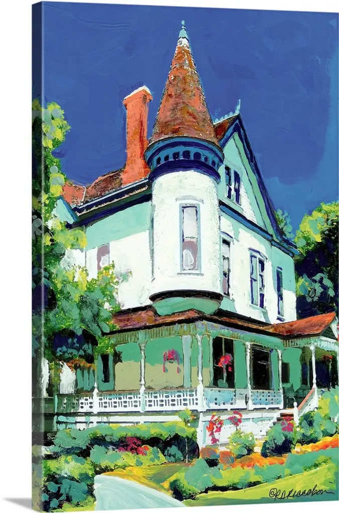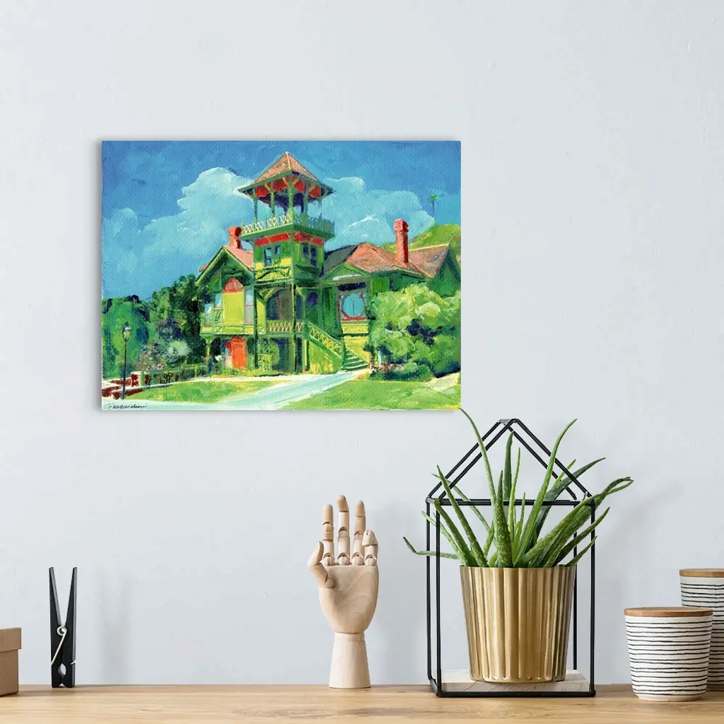 Sherman-Gilbert House, painted by San Diego artist RD Riccoboni, was built in 1887 and is a Stick Eastlake Victorian House. This house was built and first owned by John Sherman, cousin of General William Tecumseh Sherman. The widow's walk and circular window are key elements of this also known as a belvedere. This house was the first structure moved to Heritage Park, in the spring of 1971. From 1892 to 1965, sisters Bess and Gertrude Gilbert, patrons of art and music, brought internationally famous entertainers to receptions in their home. Among the artists were Yehudi Menuhin, Ernestine Schumann-Heink, and Artur Rubinstein.