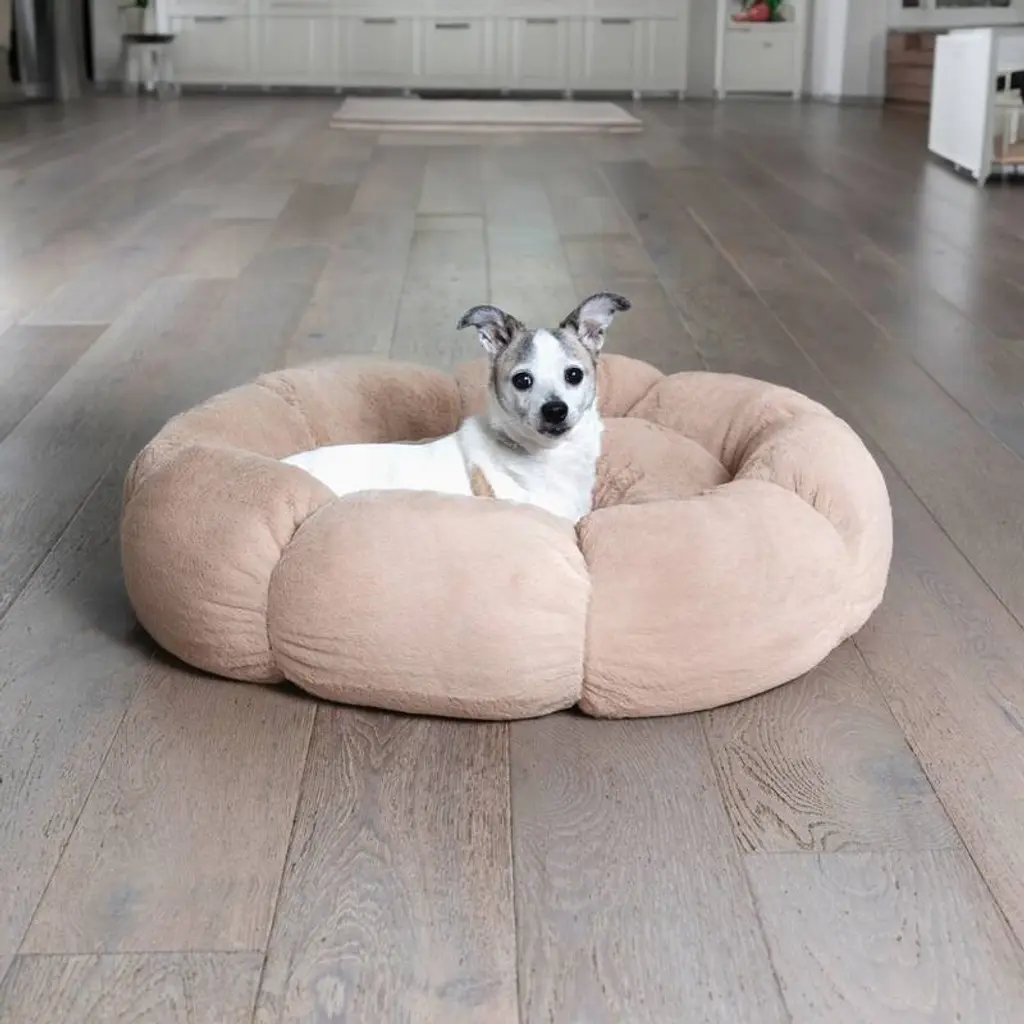 Show your love to your pet with our Sherry Kline Pets Original daisy flower round donut shape bed. Comfortable for small to extra-large dog breeds or cats. Our daisy flower shaped pet bed is designed to provide ultimate comfort and a cozy retreat for your furry friend. The plush cushioning and elevated bumper ensures a peaceful and restful sleep, promoting overall well-being. The elevated style bumper offers extra comfort for your pet to rest his/her head or relax their legs.The sleep and sitting area offer a reversible Ultra Plush fabric material. Your pet will relax and enjoy sitting and sleeping on our soft and cozy daisy bed. The ample size offers a secure and snug space for pets to nap or lounge while feeling safe and protected.