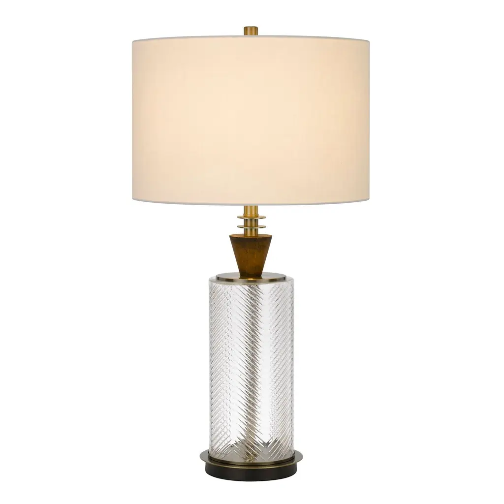 Update your décor with this column style table lamp. It features a striped clear glass base with wooden accents and metal base. Lamp ships complete with coordinating shade and finial.
