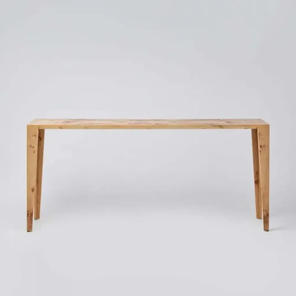 A simple Scandinavian silhouette showcases the stunning depth and intrigue of ash burl in the form of the Sherwood Large Console in a canyon finish. This item is made of solid wood. Item will not be exactly as pictured, subtle deviations in hue after finishing can be expected as a result of natural variations in coloration of the base material.