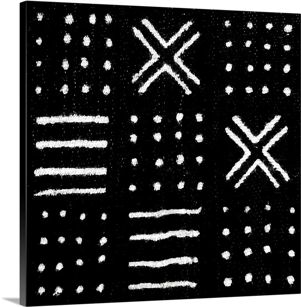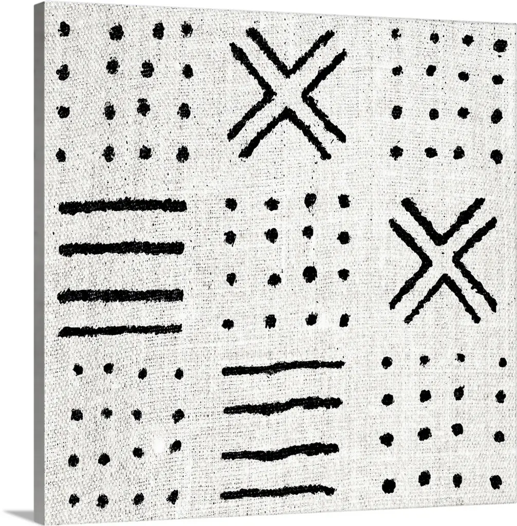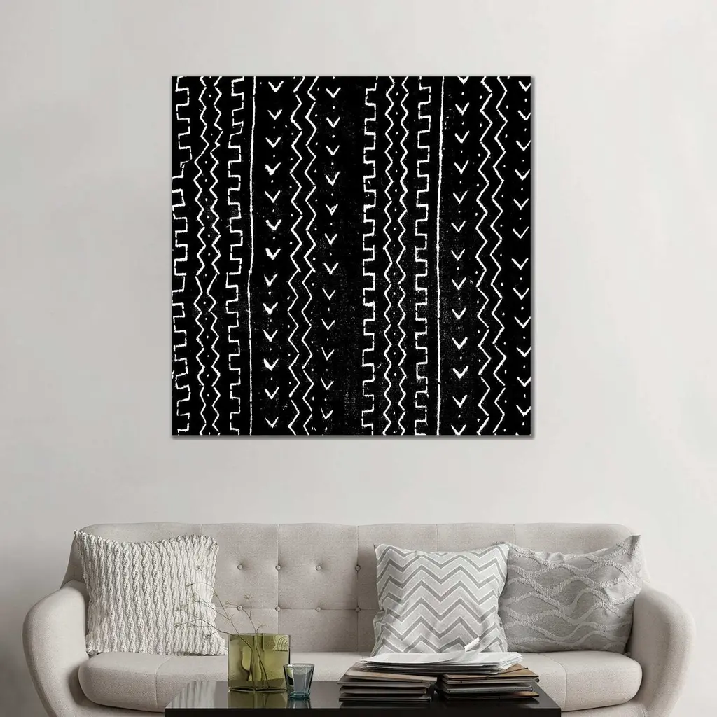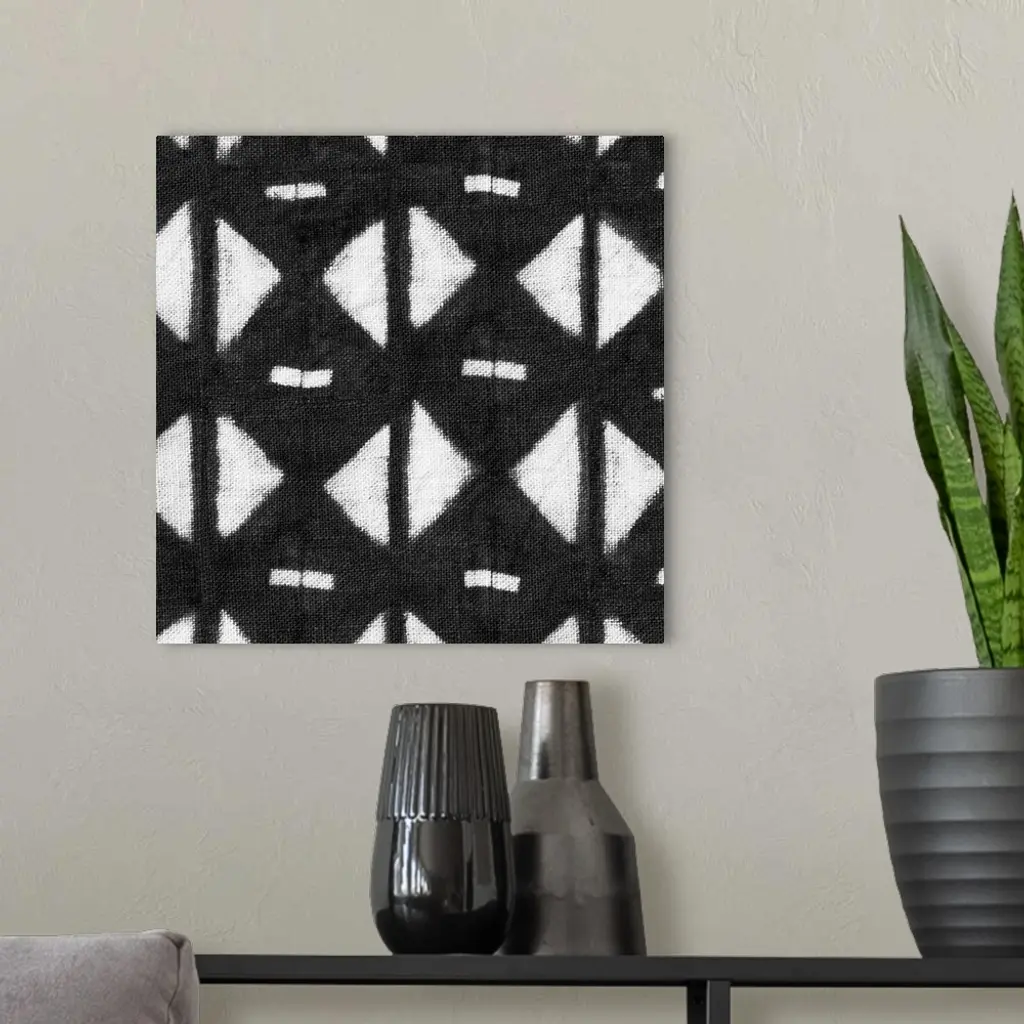 Decorative design of rows of white diamonds with lines going through them on black linen.