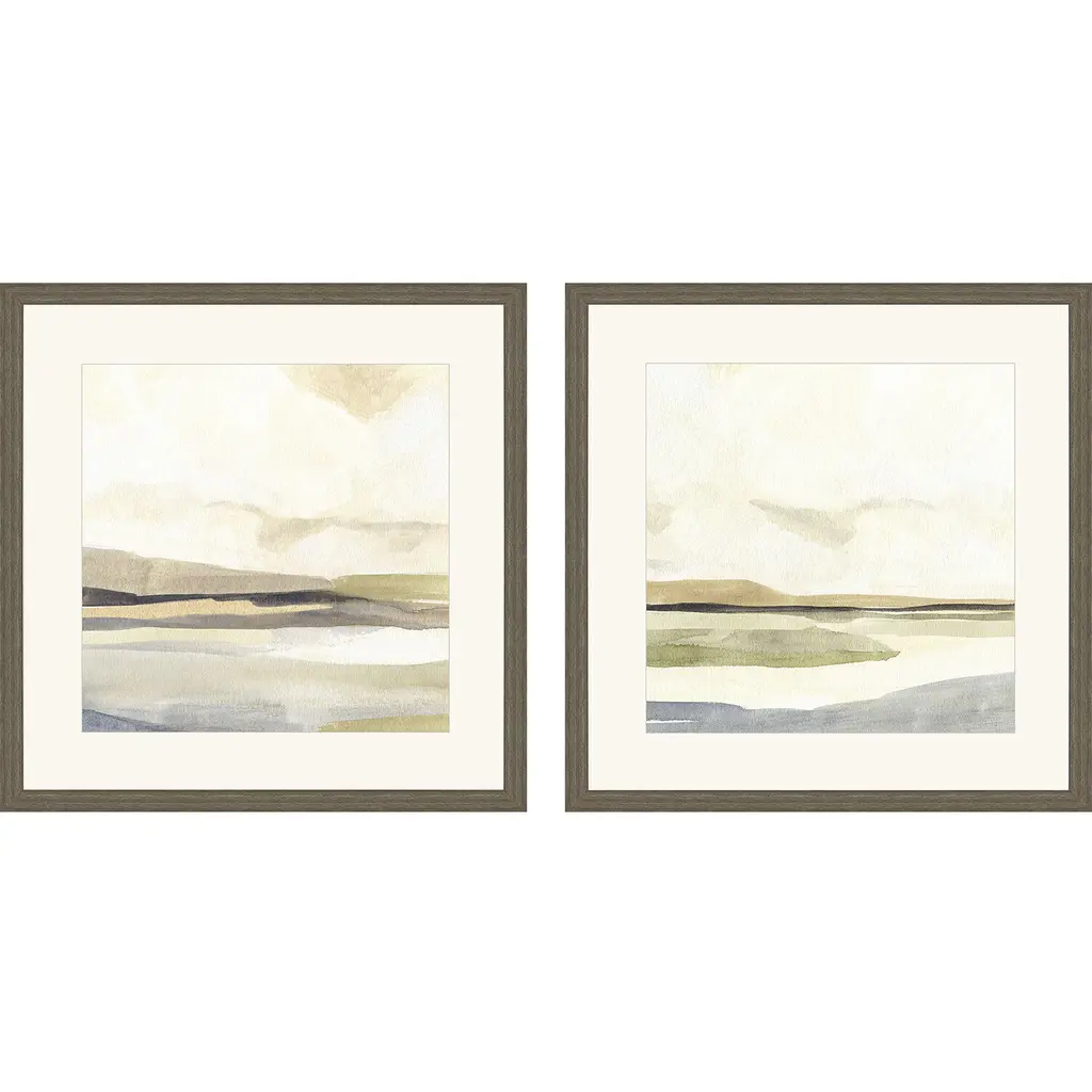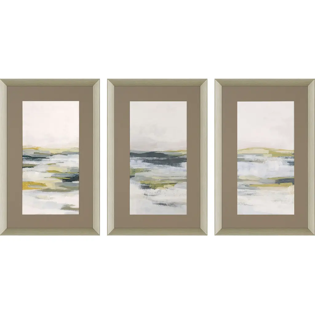 An outcropping of rocky seaside or the view across a foggy bay present a moody vibe in this abstract wall art. Matte white frames bring out bright highlights and make a lovely addition to coastal themed settings.