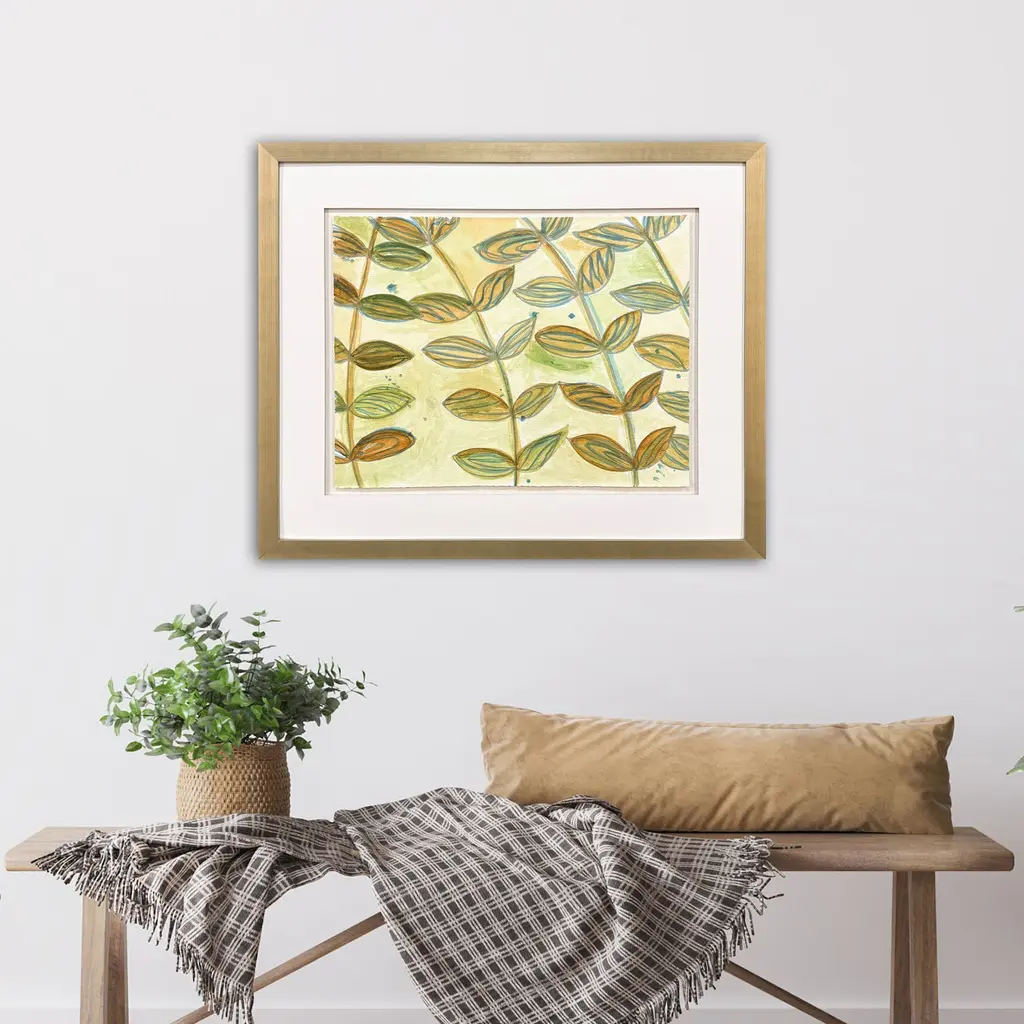 Exclusive hand painted on fine art paper. Framed in a modern antique silver leaf wood with champagne gold wash and painted black edge.