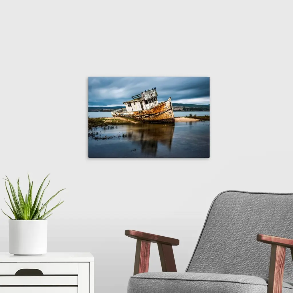 Abandoned and ruined ship beached in shallow water at Inverness, California.